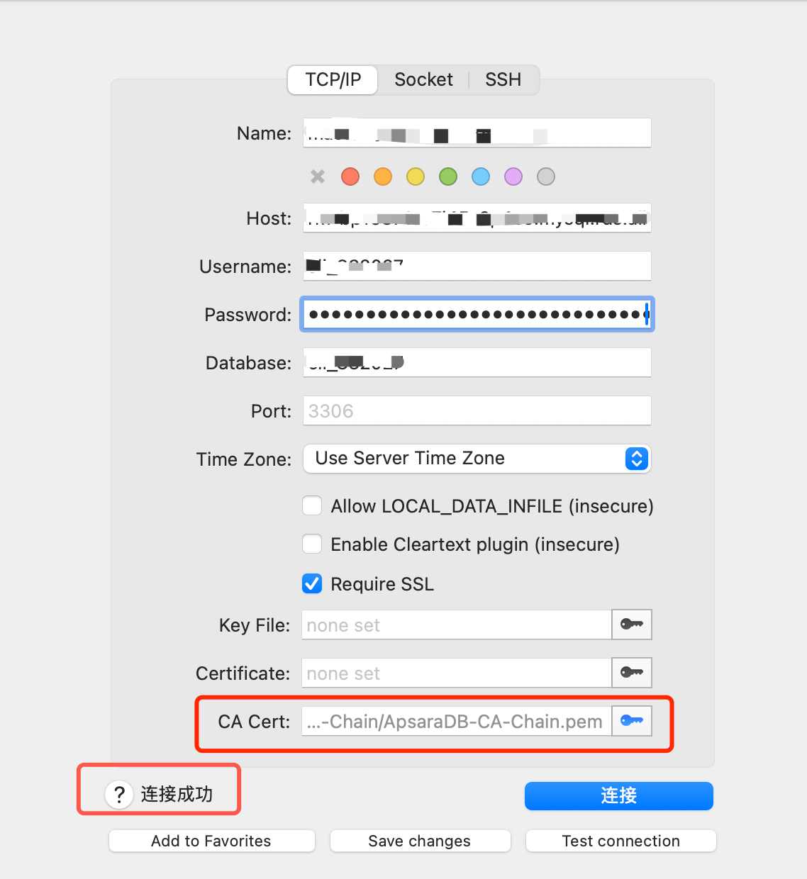 - 点击 SSL,在 CA 证书处上传我们提供的 .pem 文件,测试连接,成功后即可点击确定