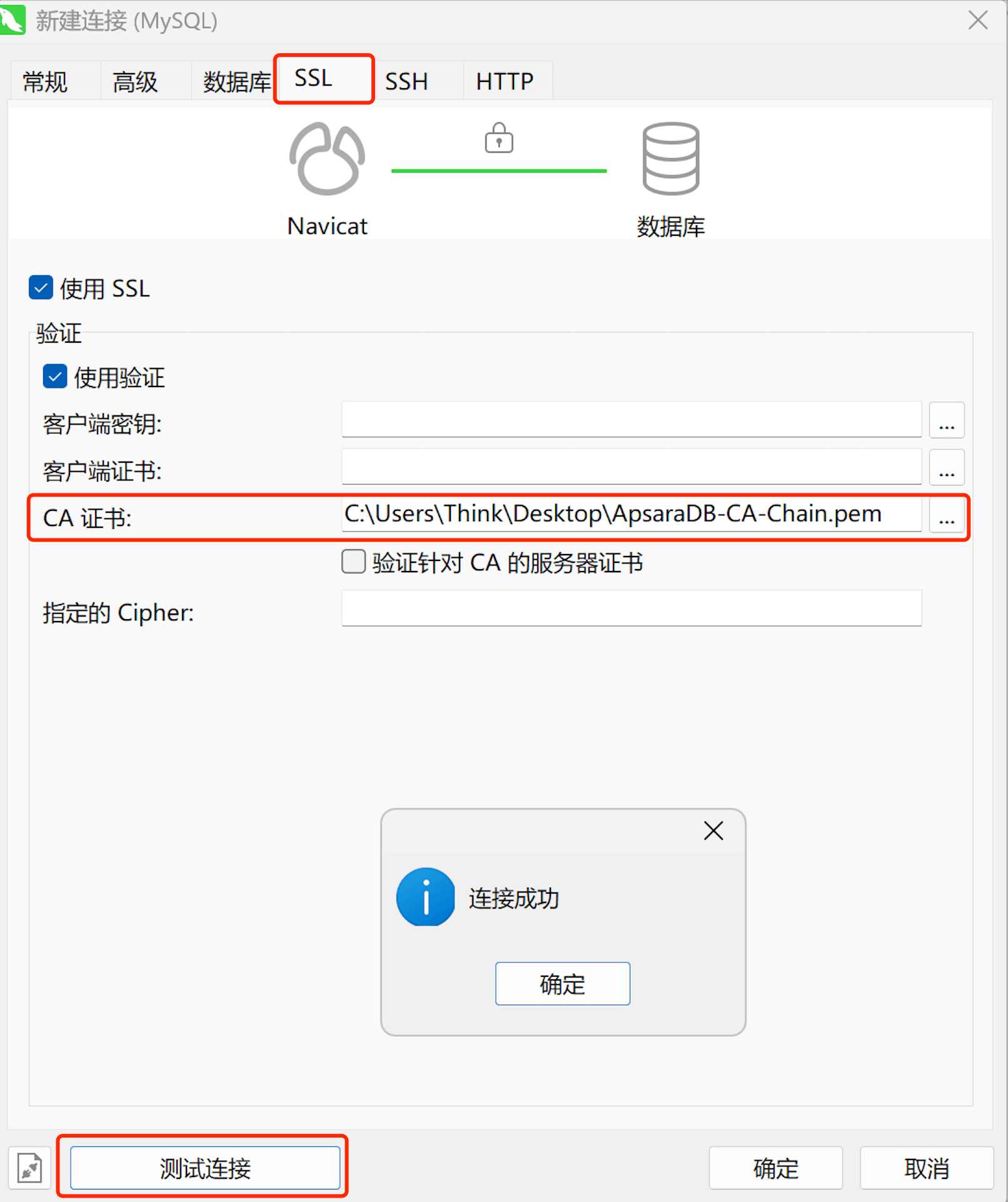 👉 配置完成后,Navicat 会通过 SSL 加密传输数据。若有疑问请点击查看Navicat官方教程