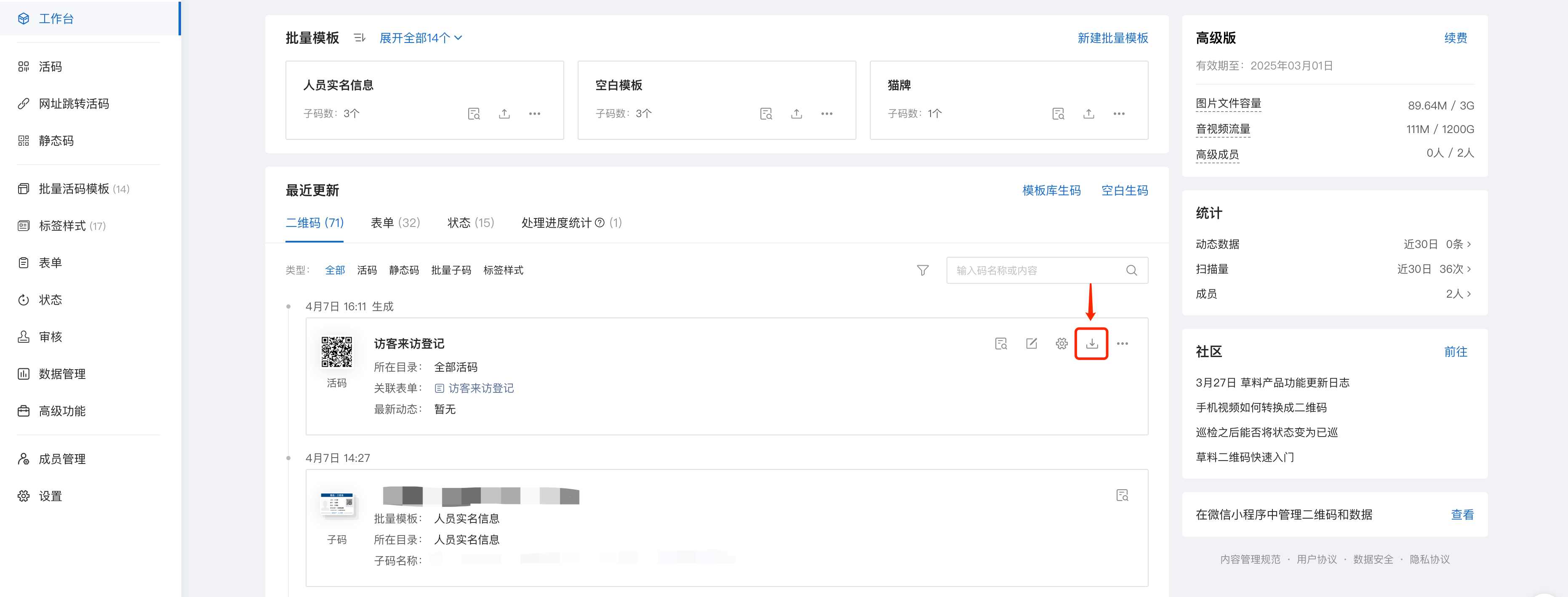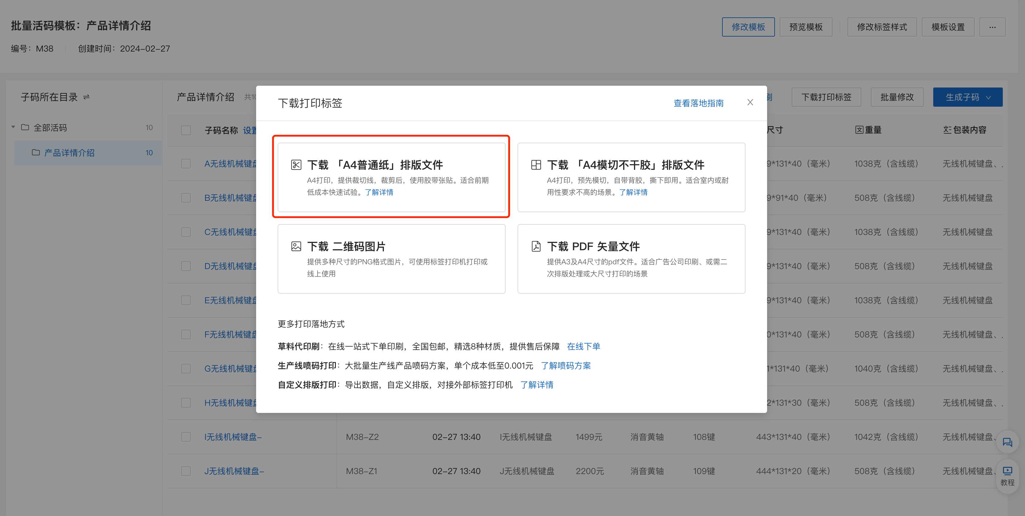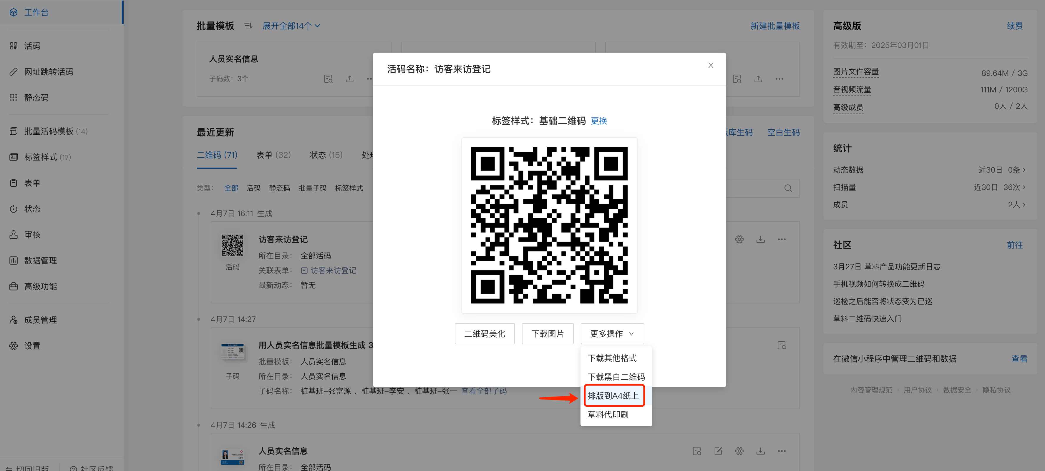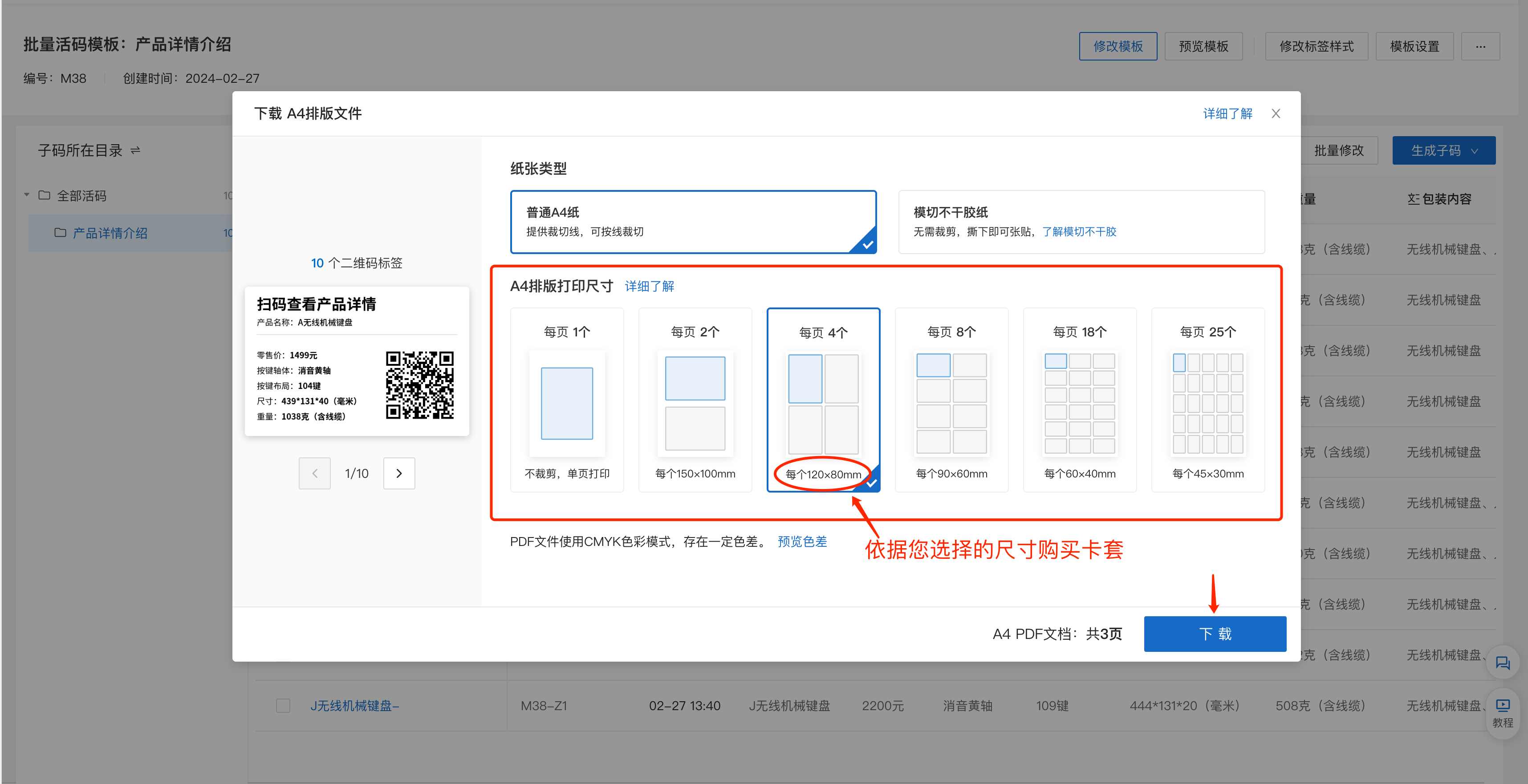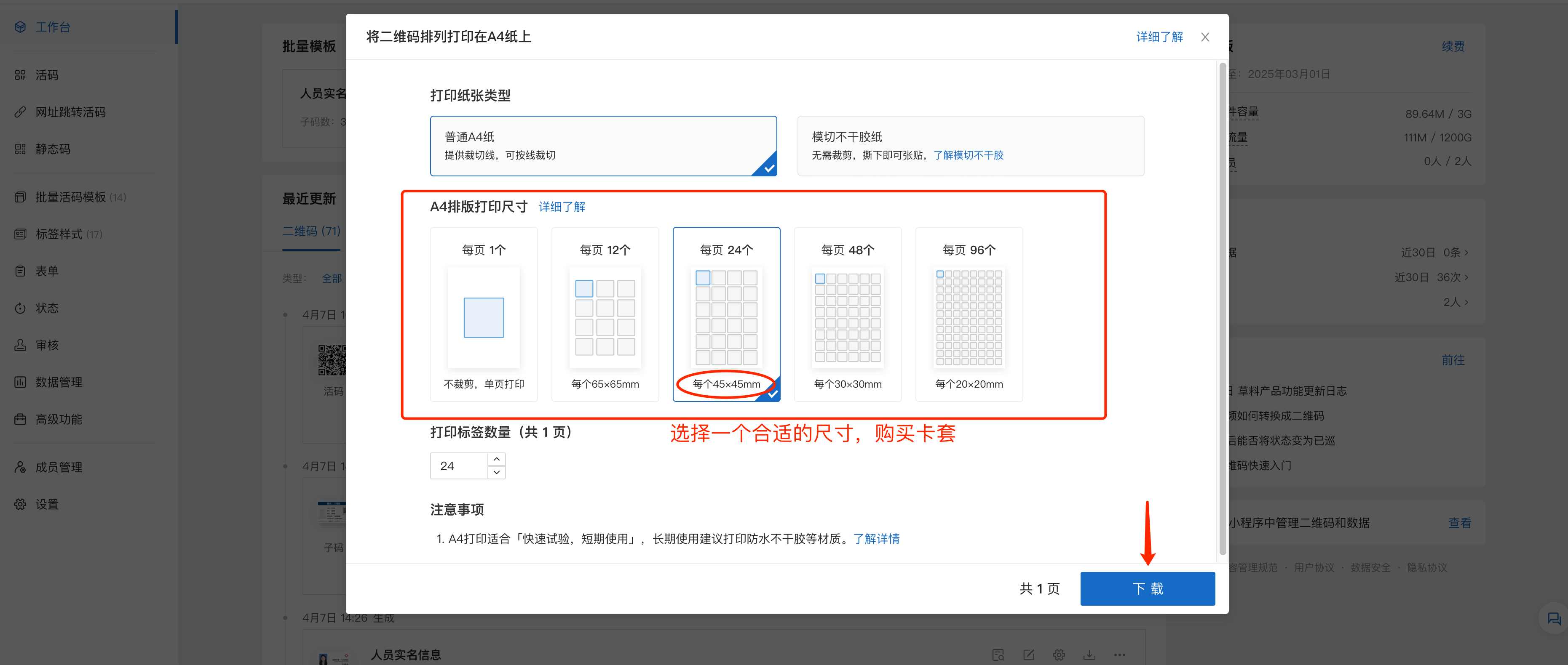 请注意!购买卡套前,要先查看制作好的二维码在A4纸上的排版尺寸,该尺寸由草料提供,请依据该尺寸进行卡套选购。查看排版尺寸的方式和【下载排版文件】的方式相同,请继续浏览下方内容。