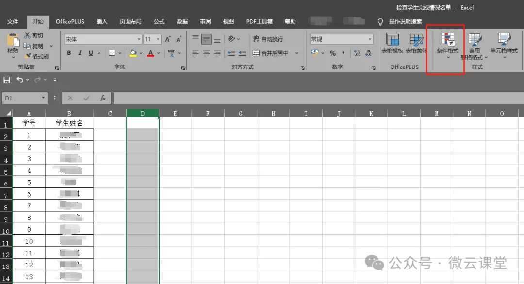 在全班花名册Excel表格中,选择1列,然后在菜单栏中找到“条件格式”~“突出显示单元格规则”~“重复值”(WPS中操作相同)
