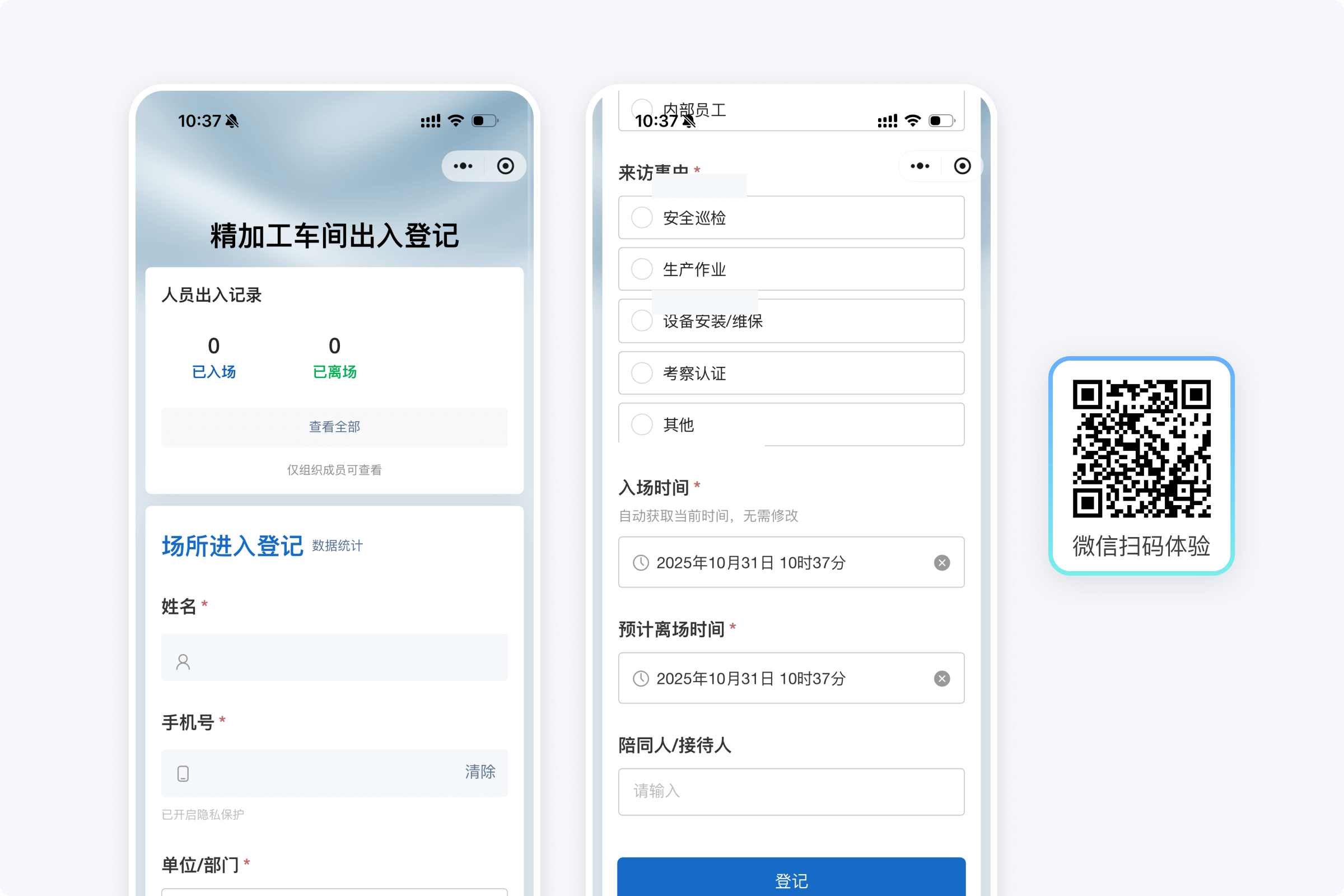 适用于工厂园区、施工场所等管理维修作业、物流运输等临时外来人员。访客扫码登记信息并拍照,系统自动记录存档,还可导出台账。