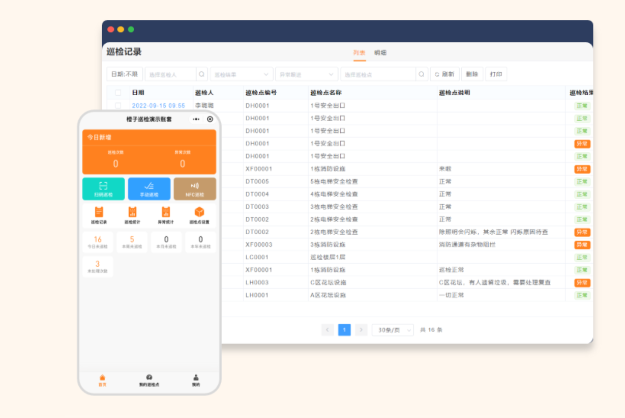 对巡检路线合规性要求严格、设备在地下室等弱网区域: 橙子巡检。支持 NFC 核验和离线巡检,解决二维码方案在特殊环境下的局限。