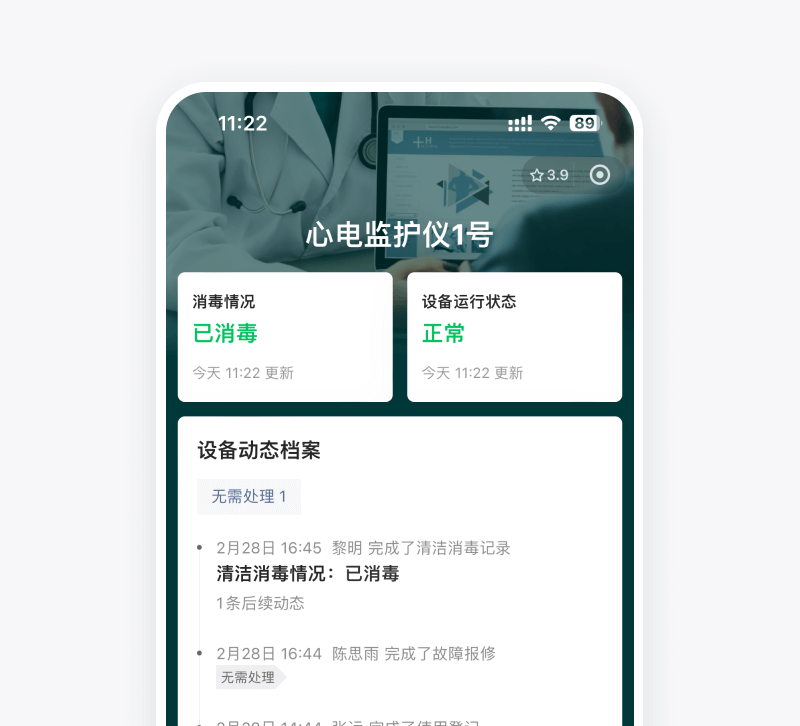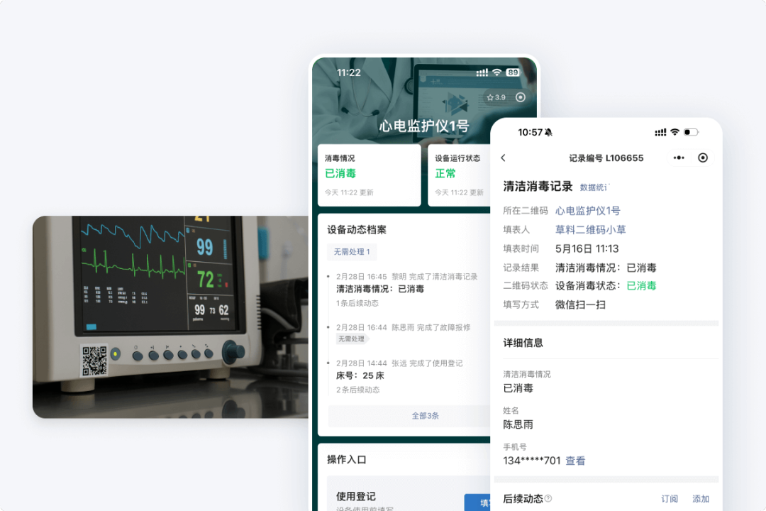 设备使用、消毒、借调和维保都可以扫码记录,不再依赖纸质台账