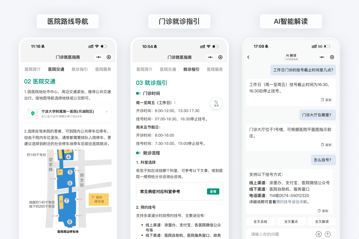 可汇总展示路线导航、挂号指引等不同模块的信息