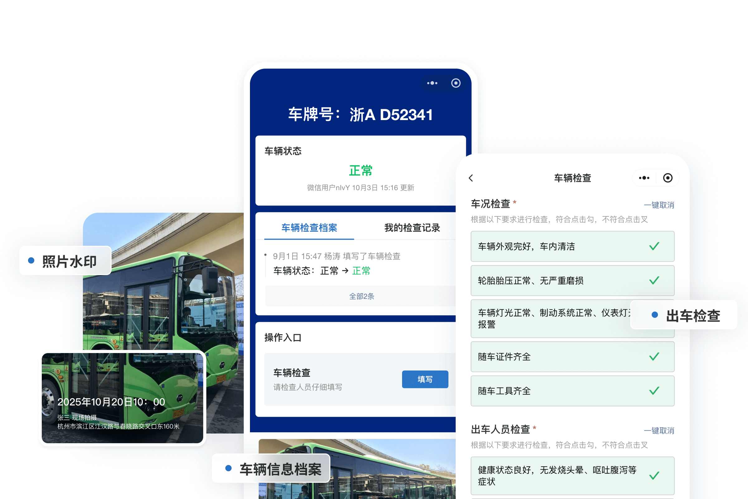 - 出车前检查:司机扫码登记任务信息、油量、里程,现场拍照上传仪表盘与车辆外观