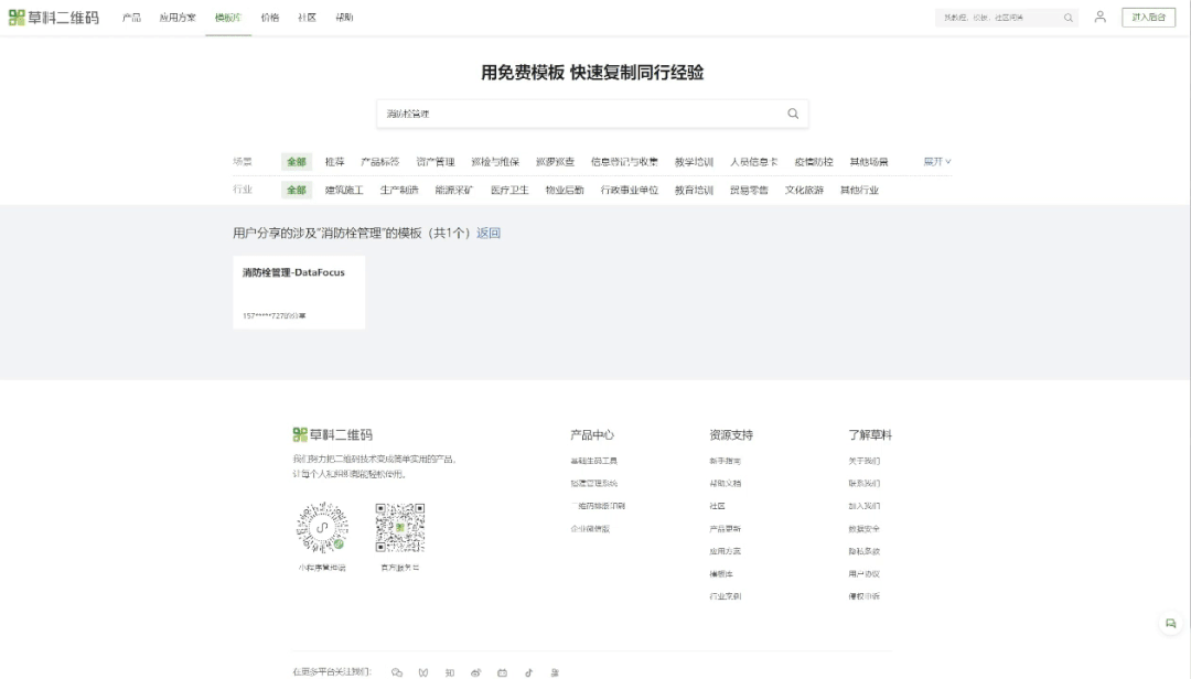 First, search in the CaoLiao QR Codes template library. Use the corresponding templates for fire extinguishers, alarms, and fire hydrants: "Fire Extinguisher Management-DataFocus," "Alarm Management-DataFocus," and "Fire Hydrant Management-DataFocus" to create QR codes. These templates already include forms for equipment inspection, maintenance, and fault reporting. You can also modify the templates according to your needs.
