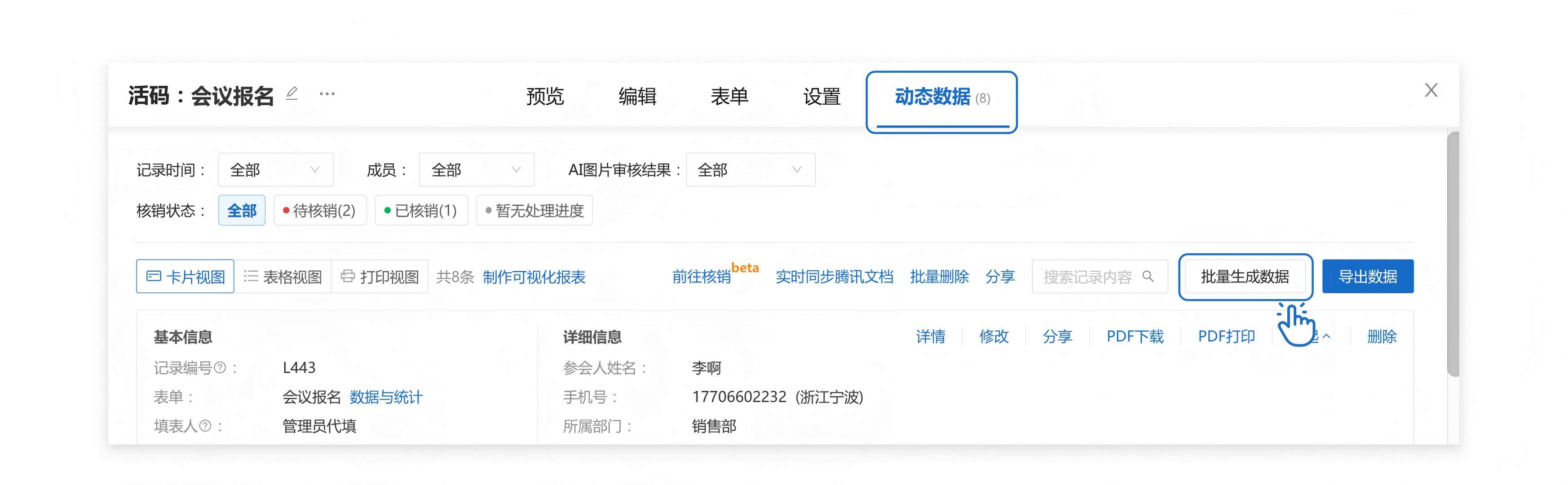 管理员批量导入数据、填写参会人的真实手机号,生成核销凭证