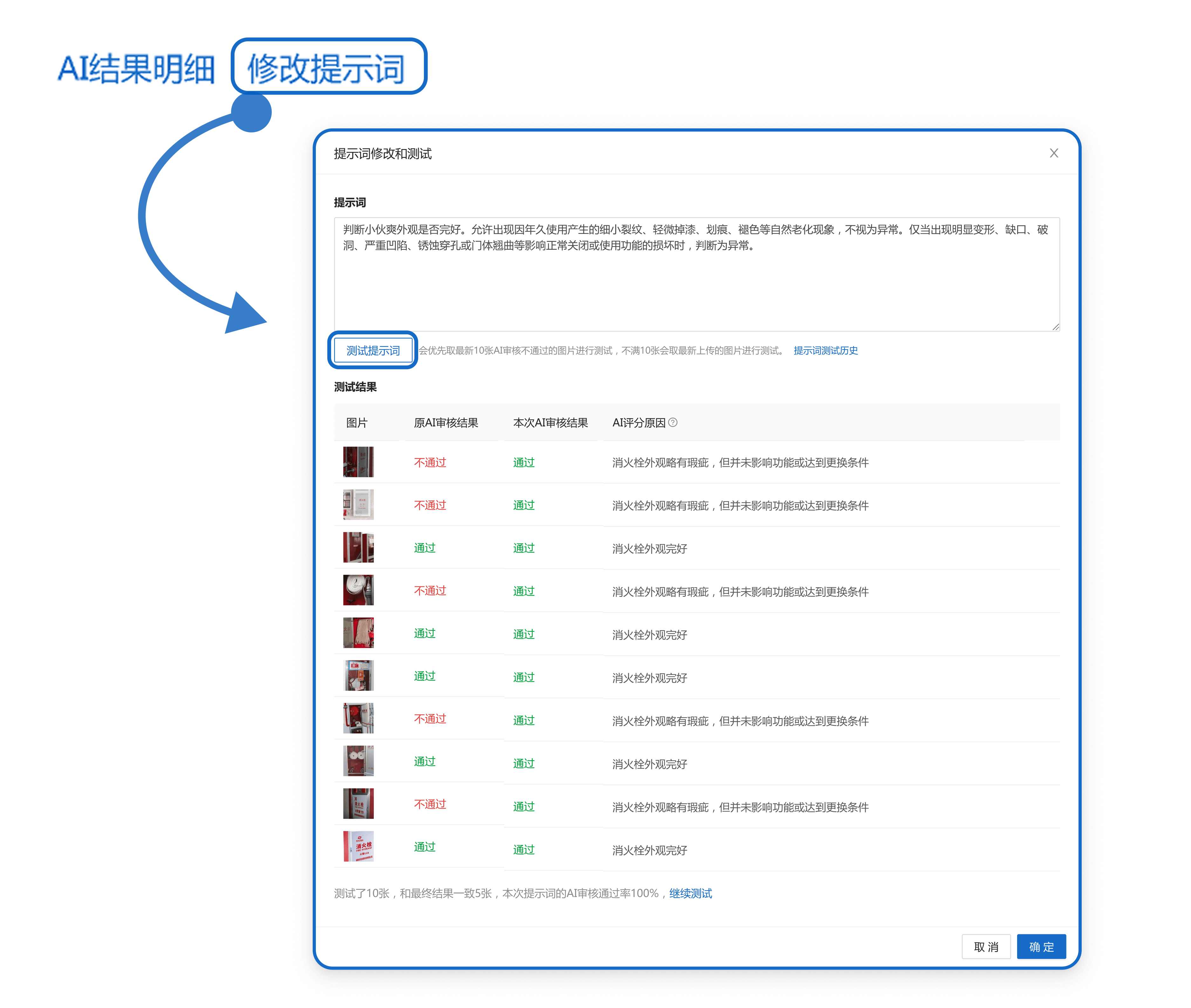 点击每个字段的“修改提示词”,可修改并测试。会优先取最新10张AI审核不通过的图片进行测试,不满10张会取最新上传的图片进行测试。