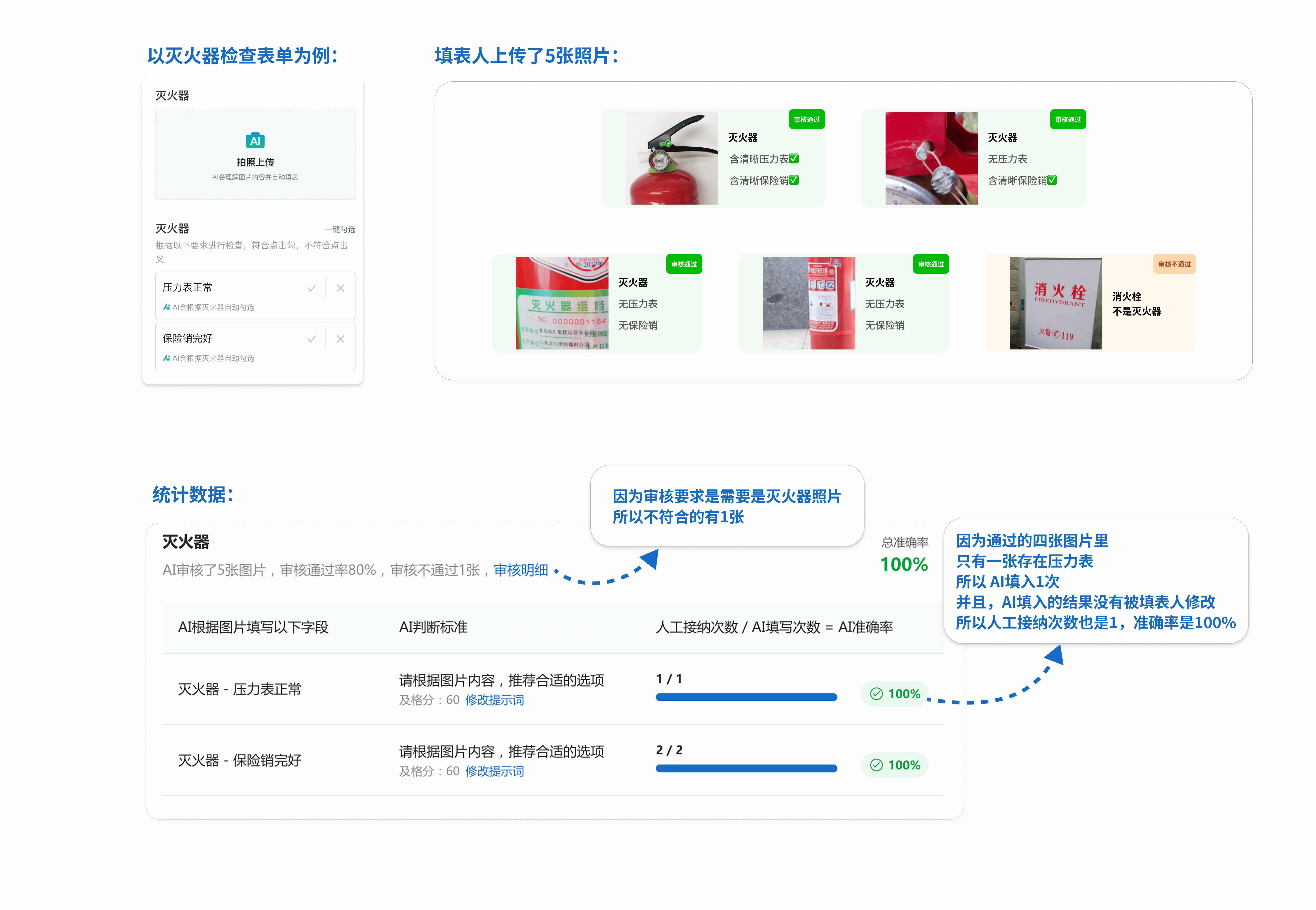 优化的提示词: “只要看到灭火器压力指针在红色区域,必须填入‘压力异常’;只有指针在绿色区域才填入‘正常’。” - 补充业务背景知识 如果物品容易混淆,需要在提示词里“教”AI 区分。