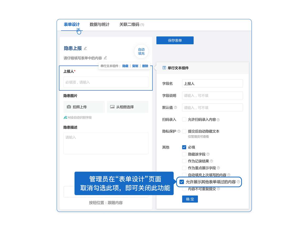 关闭后,填表人在填写该字段时将不会看到任何推荐项,界面更干净简洁。