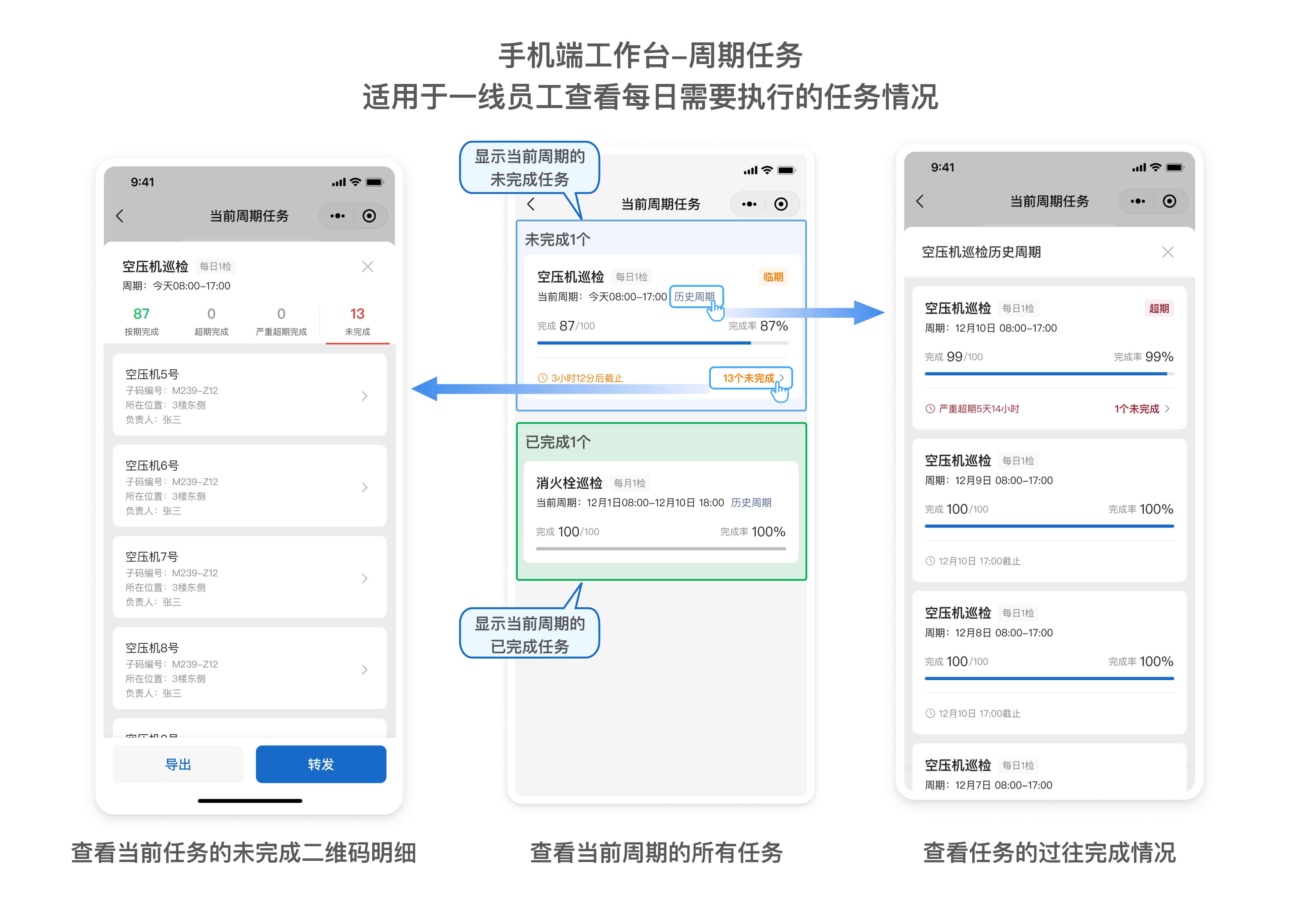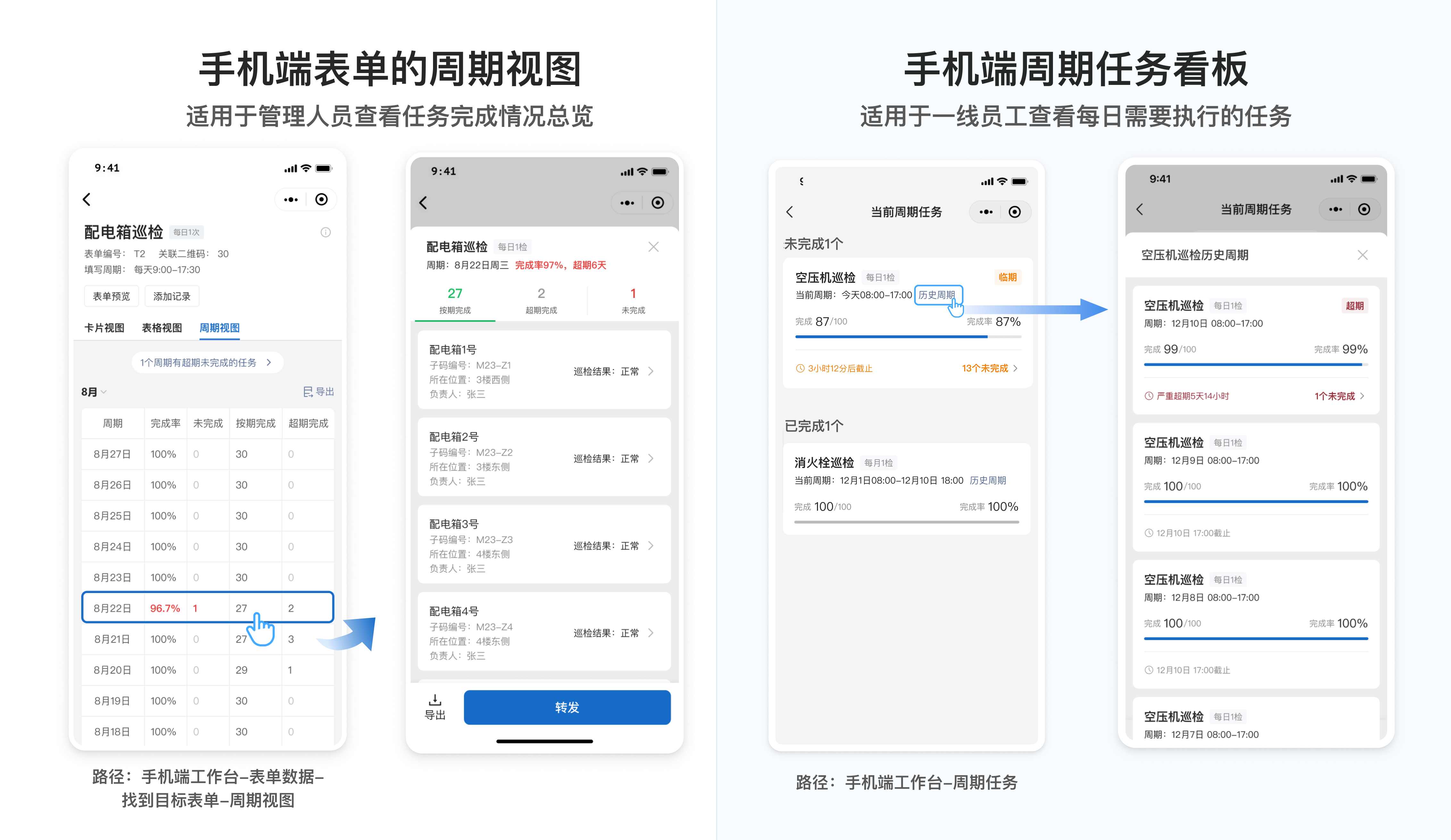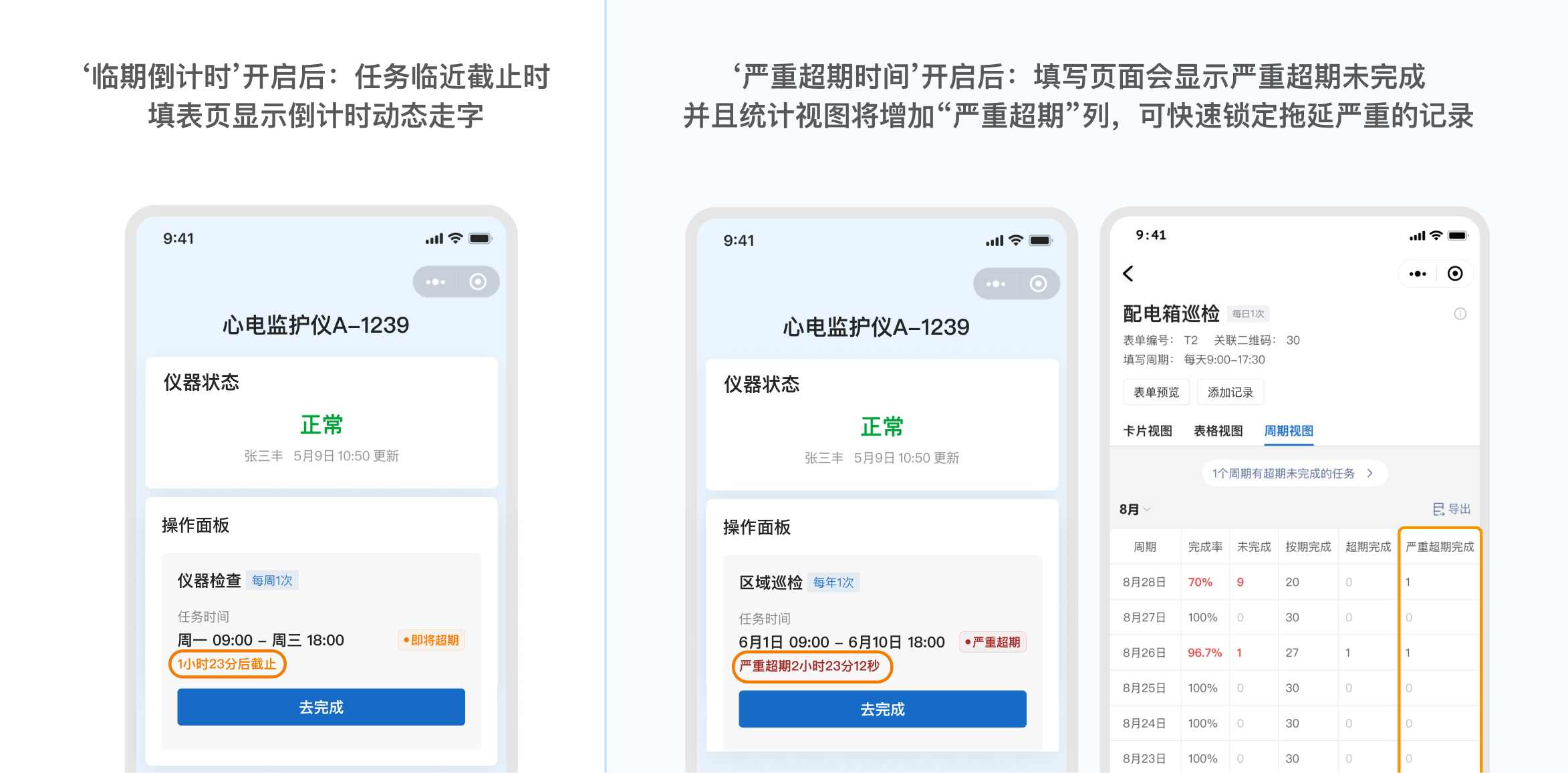 包含表单名称(如“日常巡检”)、频次标签(如“每日1次”)及任务有效时间段。 - 紧迫感设计: