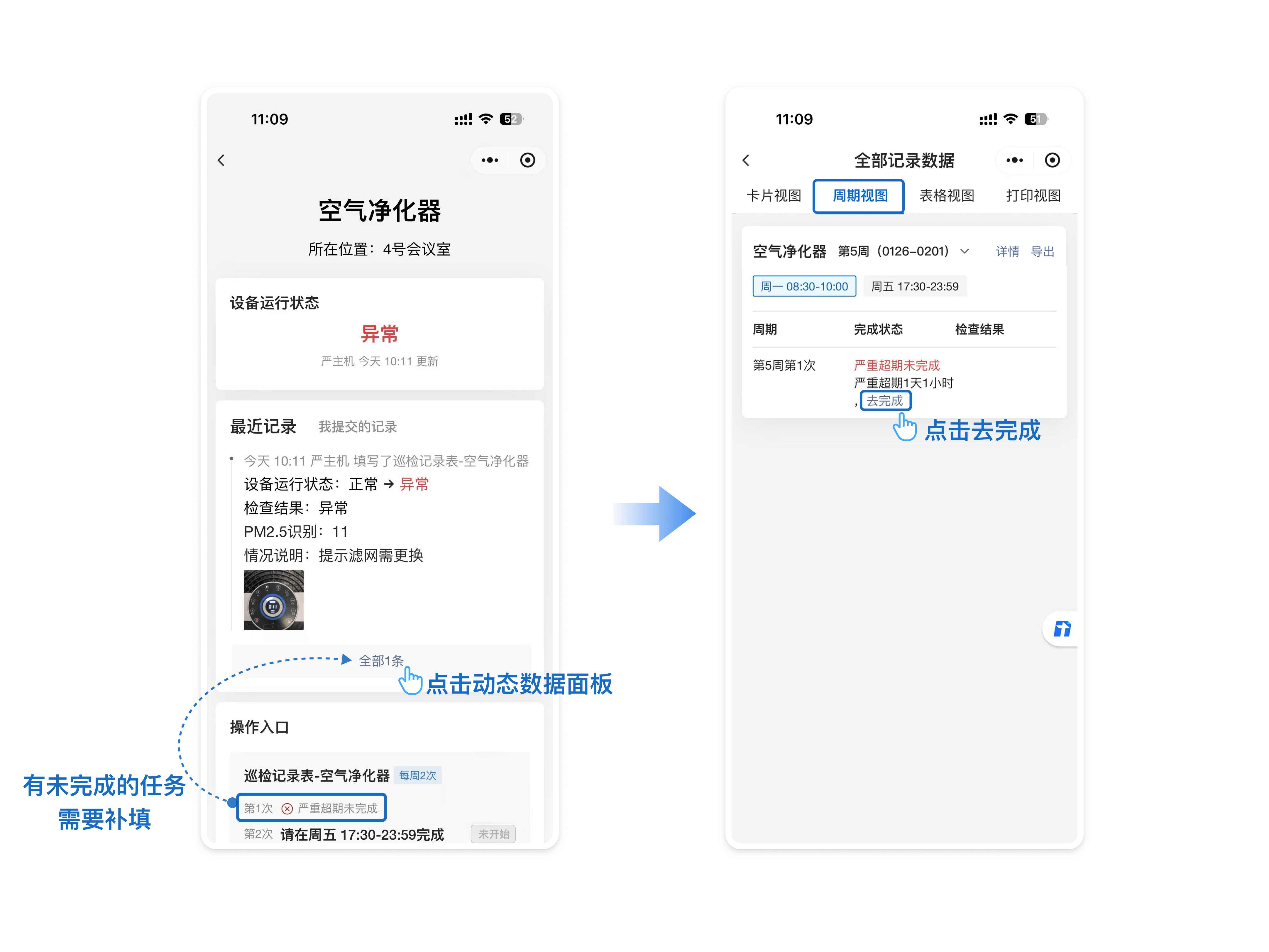 补填入口: 扫码或进入链接后,点击动态数据面板 -> 周期视图 -> 点击具体的“去完成”即可补填。
