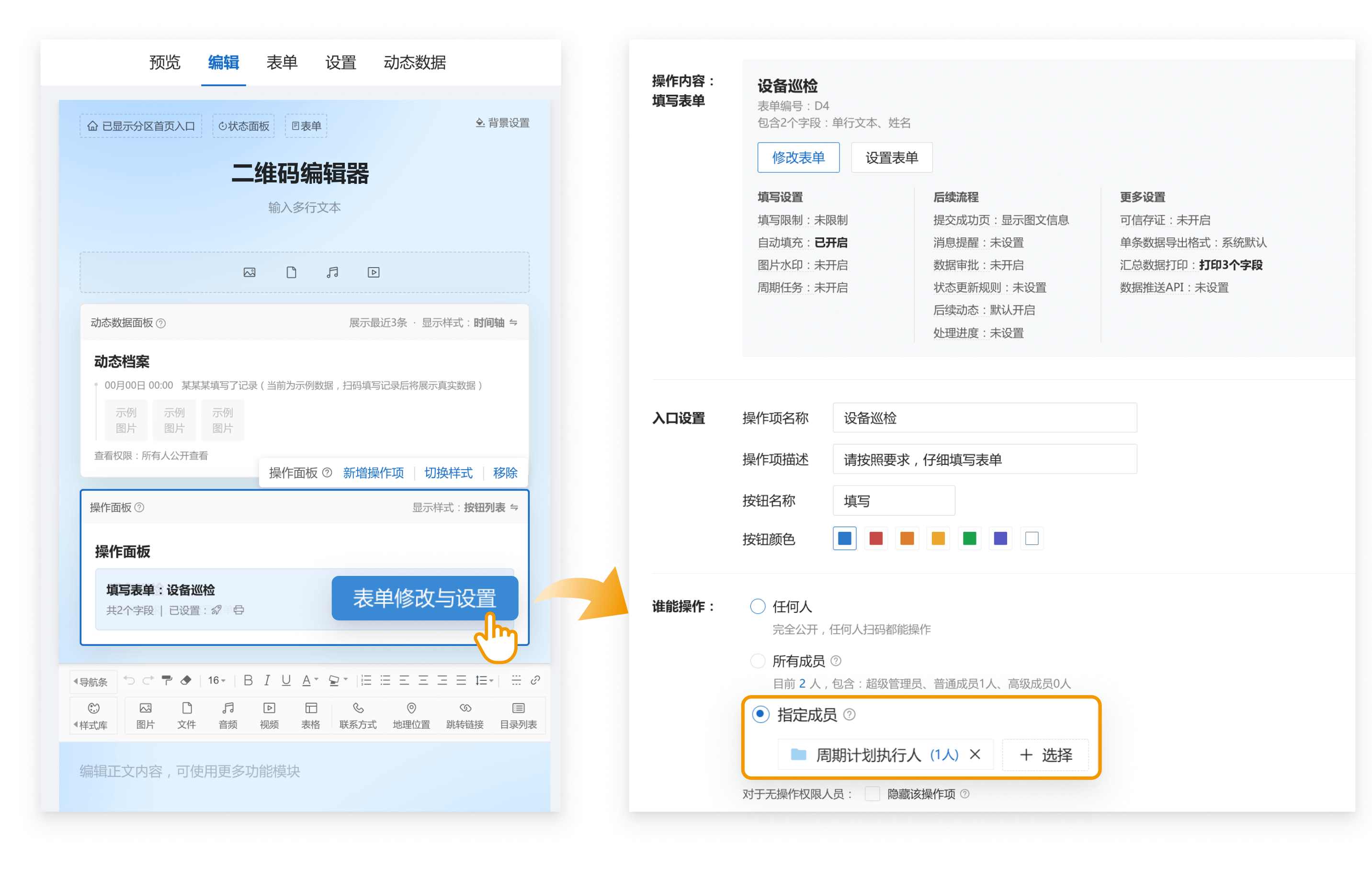 系统的提醒功能需要明确的“接收人”。若要精准提醒到“操作项操作人”,不能将二维码的操作权限设置为“任何人”。