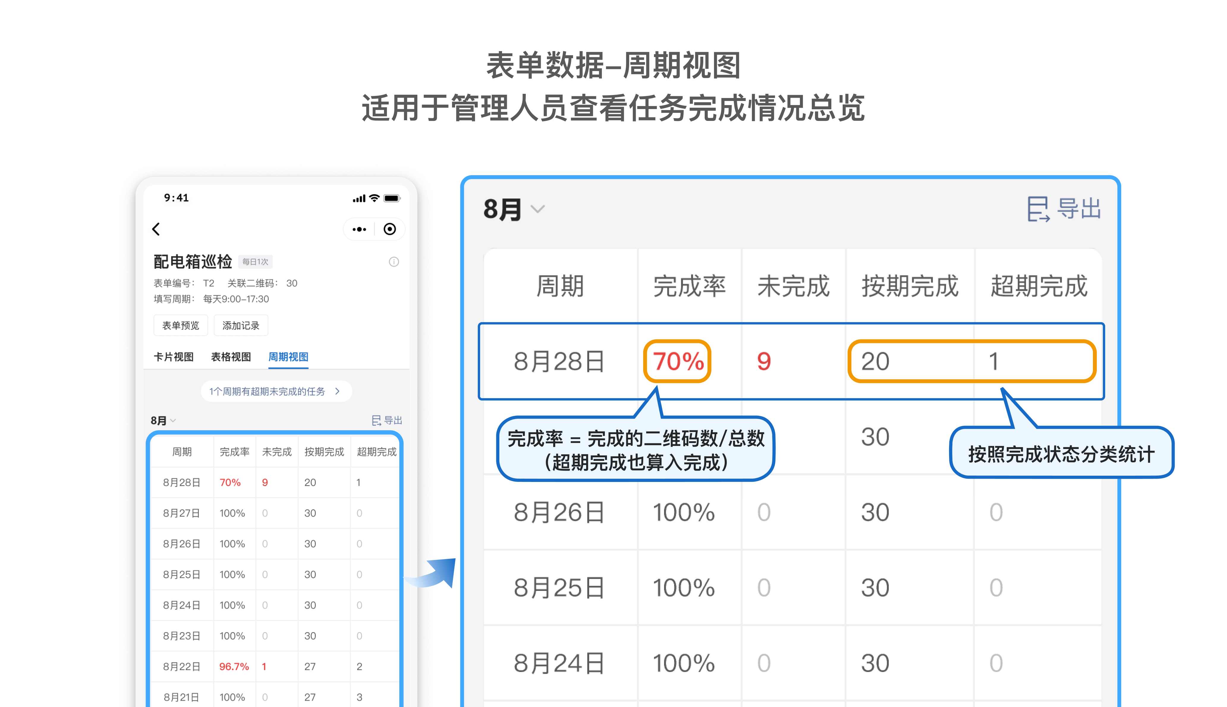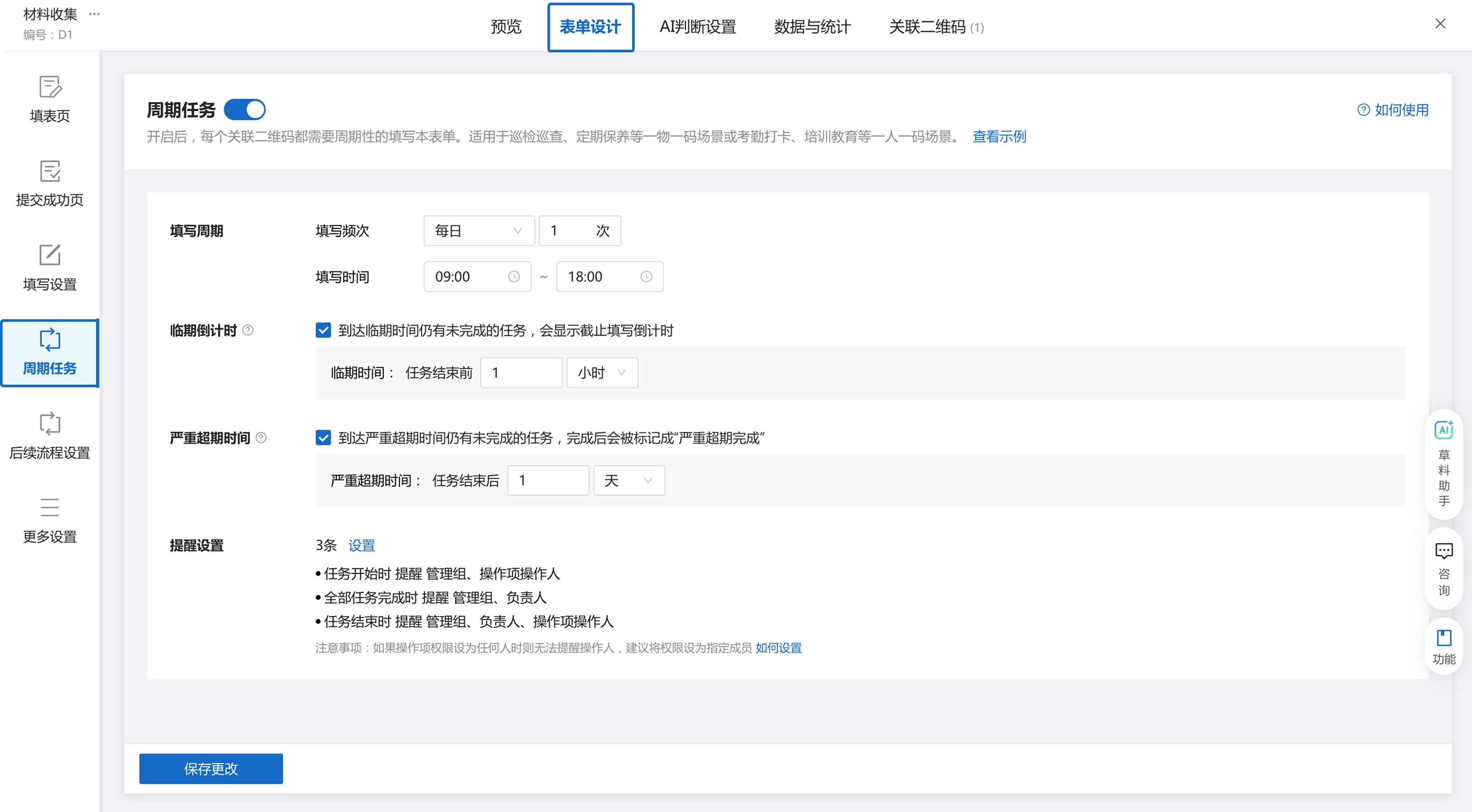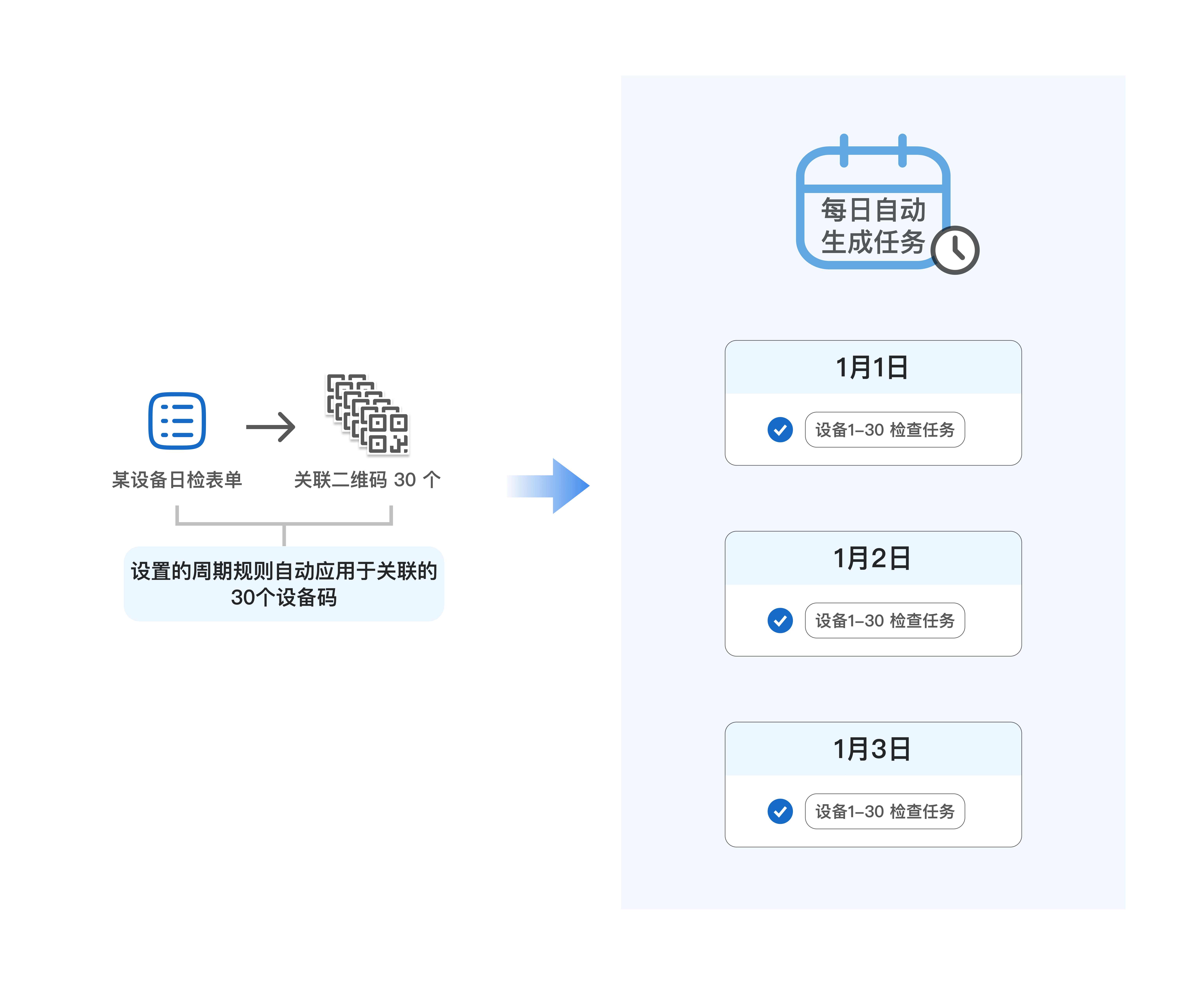 周期任务是指系统根据预设频率(如每天、每周),自动为关联该表单的二维码发布填写任务,并实时监控完成情况的功能。
