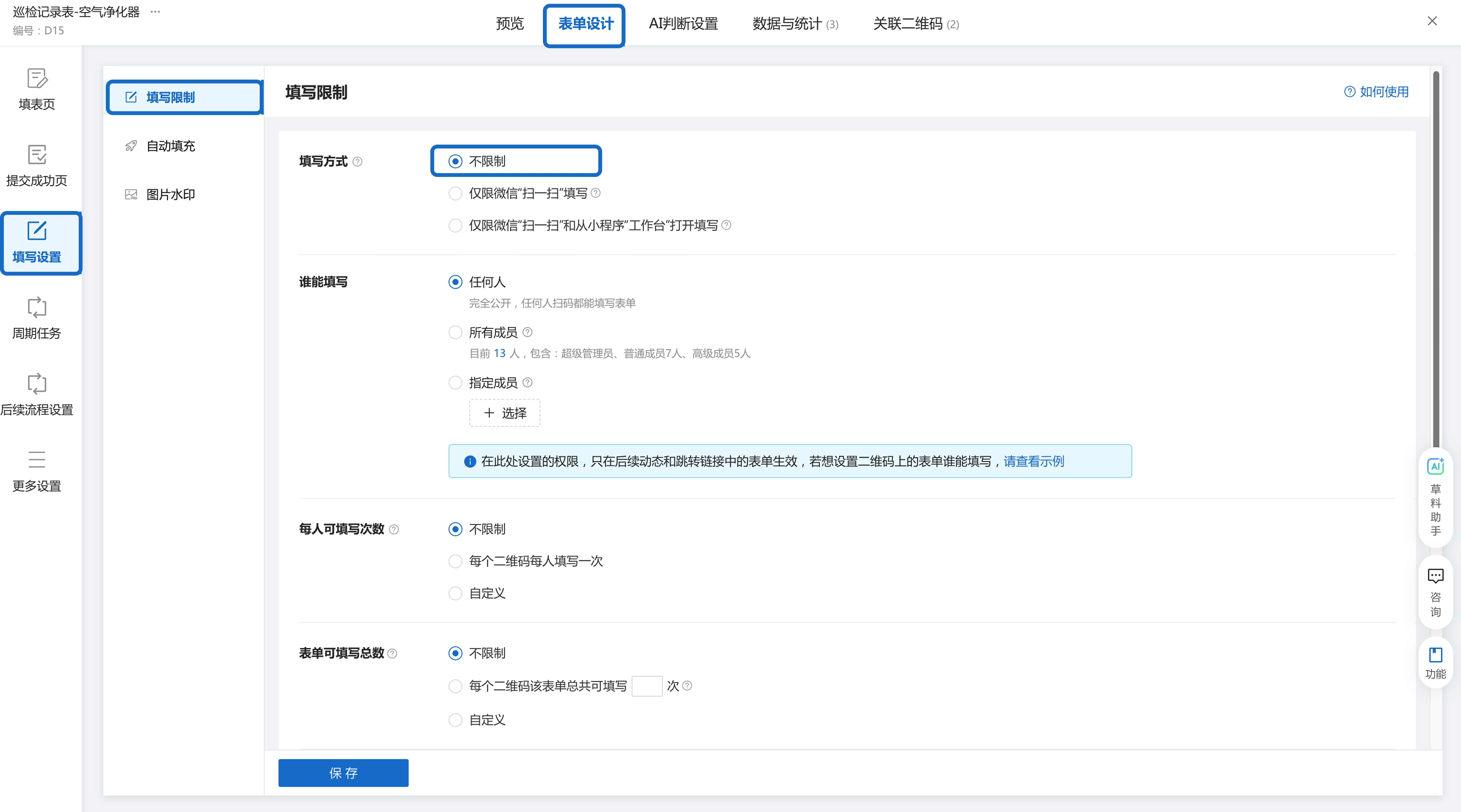 解决方案: 若需开放一线员工补填,请将表单填写方式改为 “不限制”。
