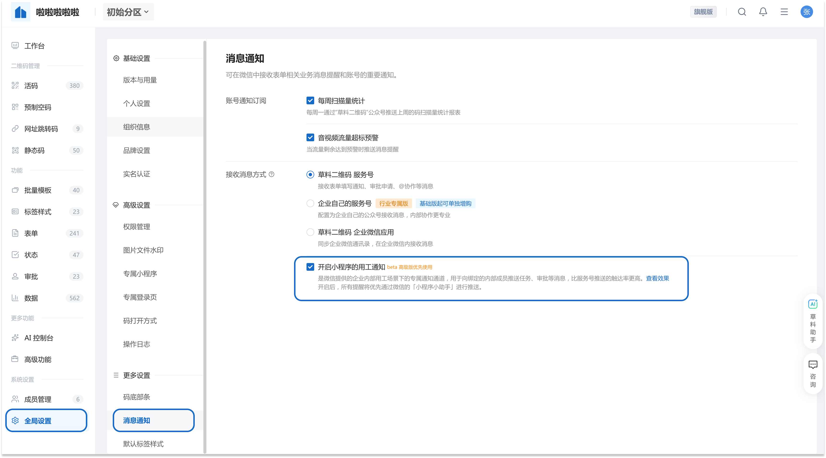1、管理员操作: 进入管理后台 -> 全局设置 -> 消息通知 -> 勾选 “开启用工提醒”。
