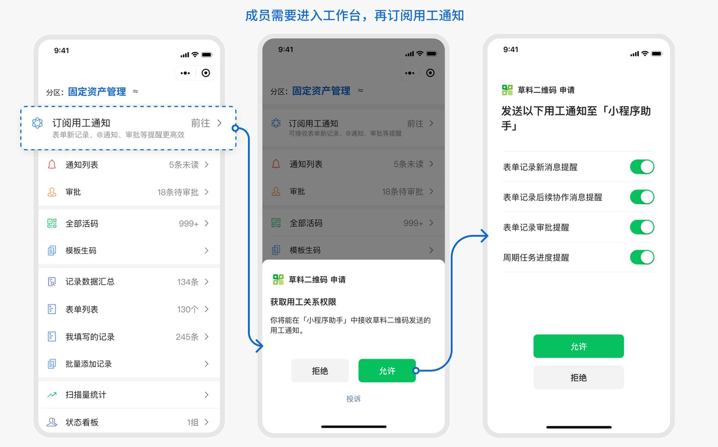2、员工操作: 开启后,需要提醒员工在手机端点击 “订阅用工通知”,订阅成功后才能正常接收强提醒消息。