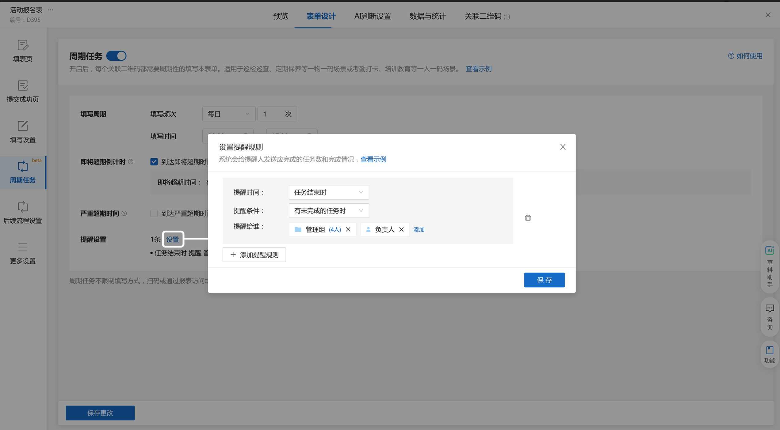 进入 “表单设计” 页面,点击左侧的 “周期任务” 进行设置。