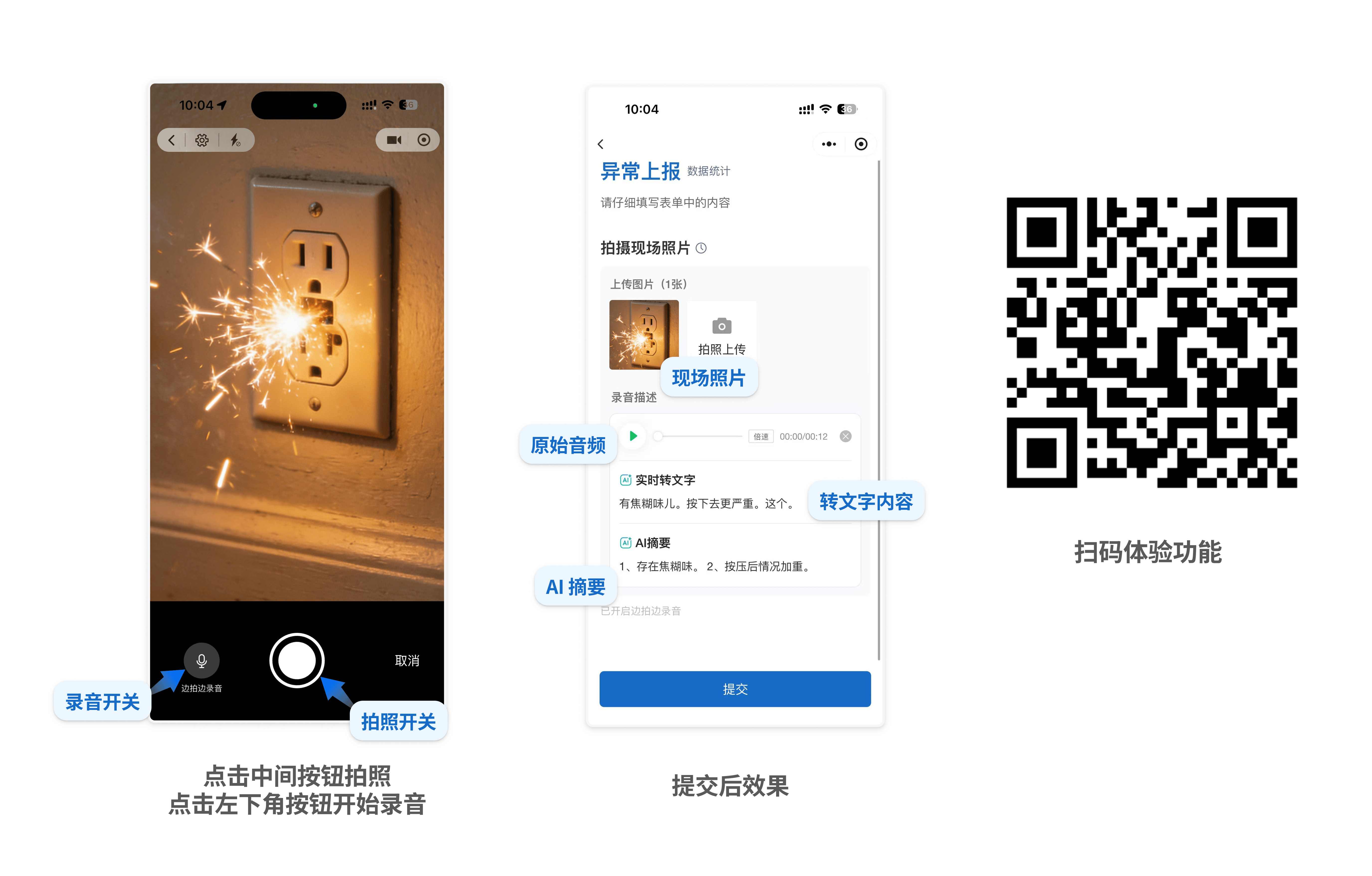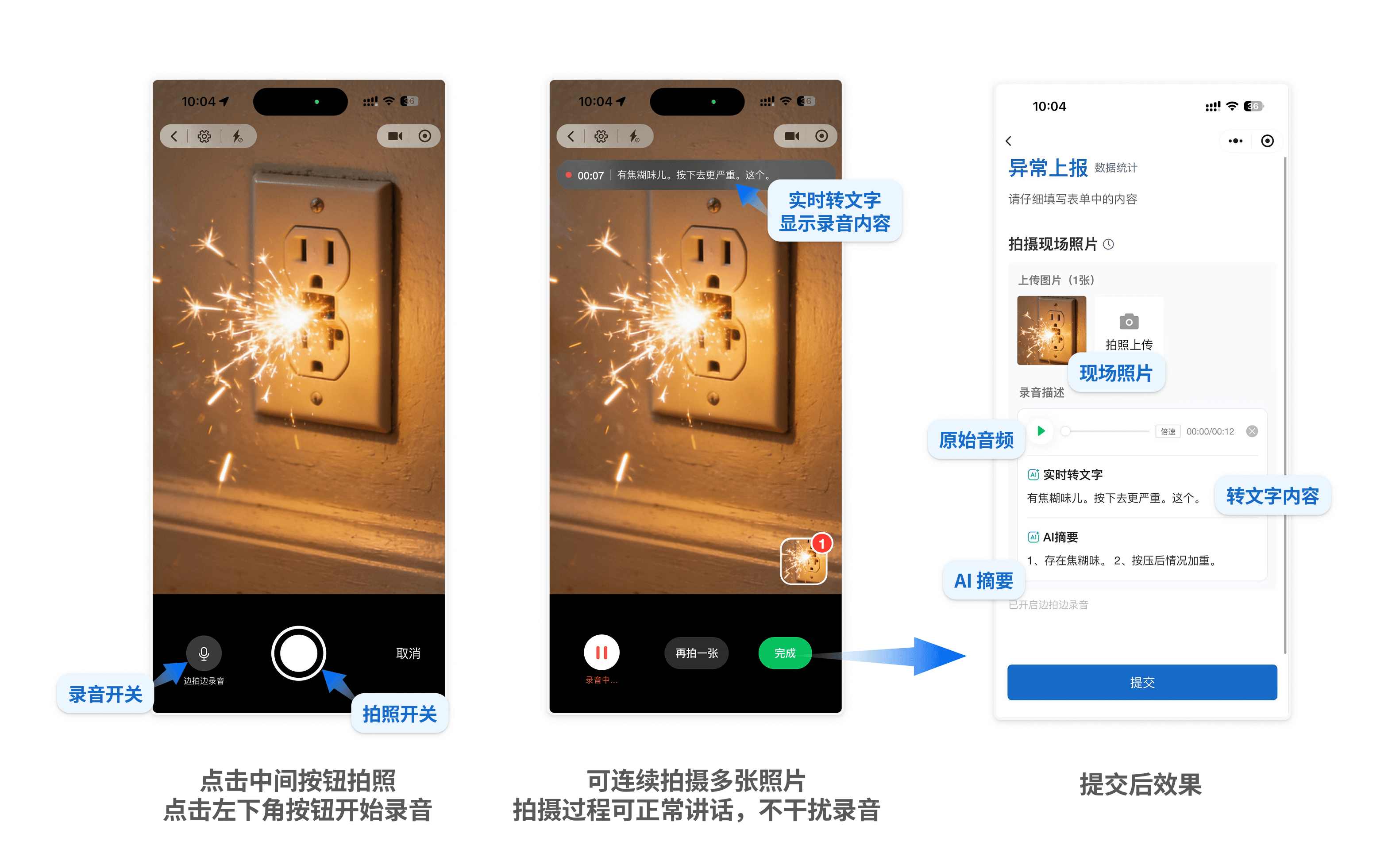 - 异常上报:员工拍到一个插座冒火花,光看照片只能看到插座,"有焦糊味、按下去更严重"这种事靠口述一句话就能补上。