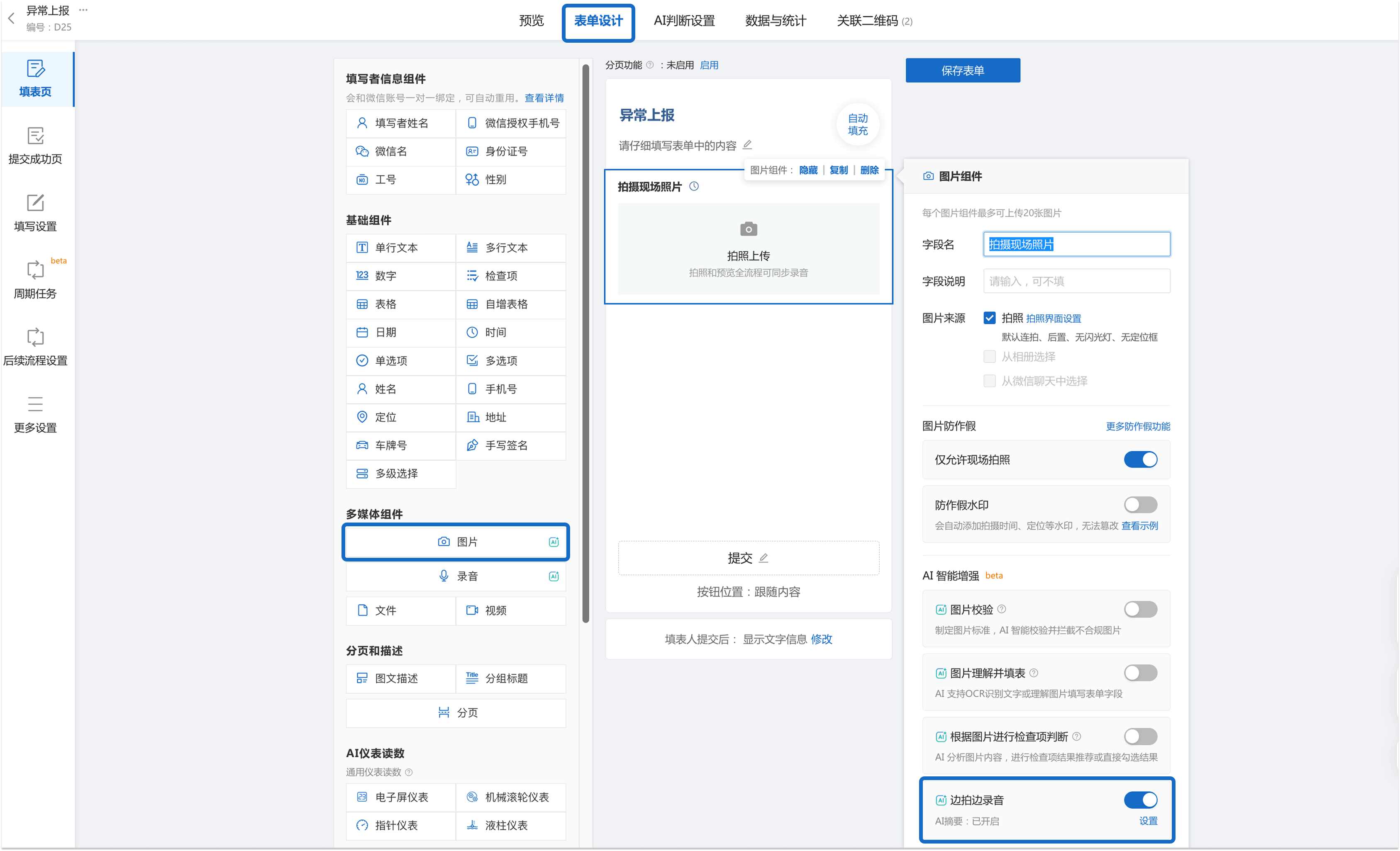 入口:电脑端打开表单 → 为表单添加图片组件 → → 打开 边拍边录音 开关。