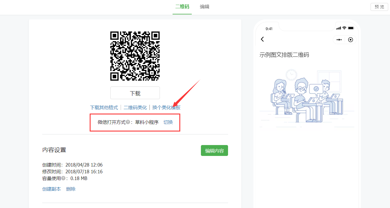 *付费前生成的二维码切换打开方式后,二维码图案会发生变化,需重新下载。