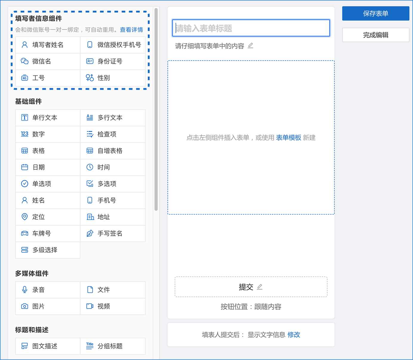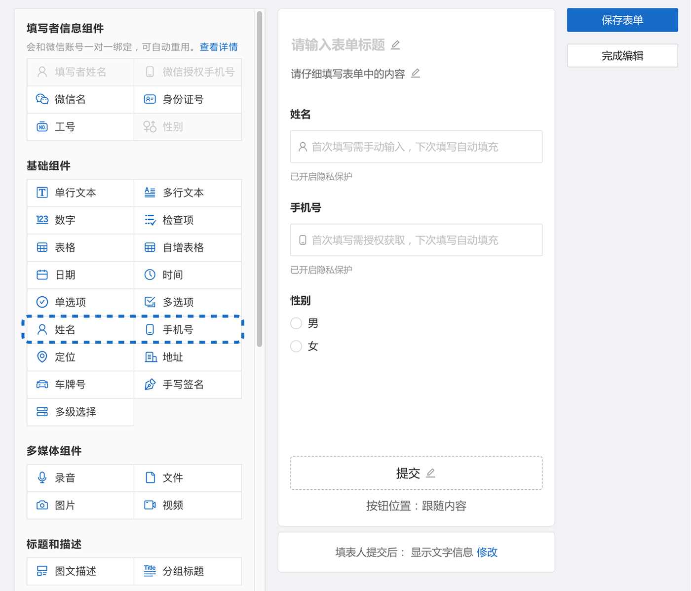 在表单设计中,系统提供了两种与姓名相关的组件:【填表人组件】里的姓名、微信授权手机号等组件, 和 【基础组件】里的姓名、手机号组件。两者的用途和适用场景有所不同,需要根据实际情况选择。