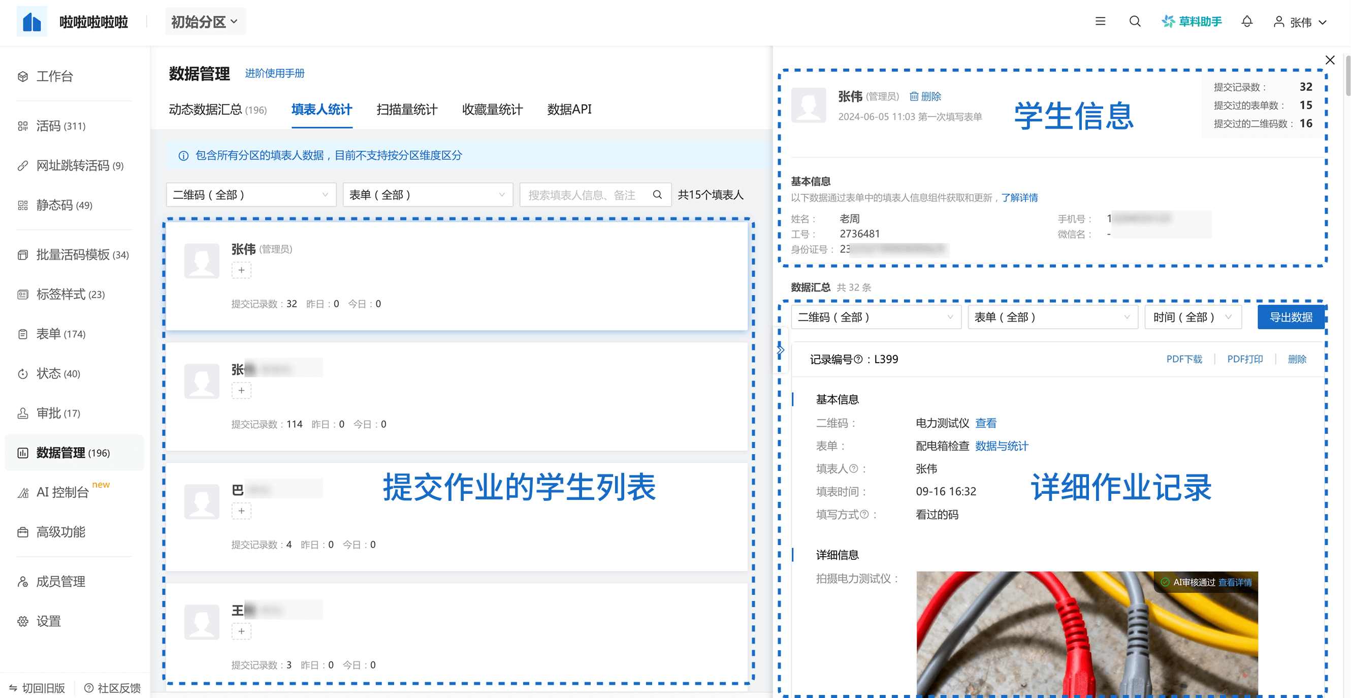 学生的课后作业可以通过记录单提交给老师,老师可以先通过筛选记录单和二维码,选定某个科目或者班级,例如选择“三年级1班二维码”-“数学课后作业记录单”: