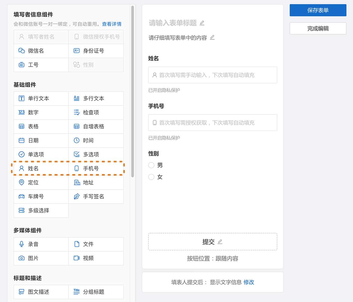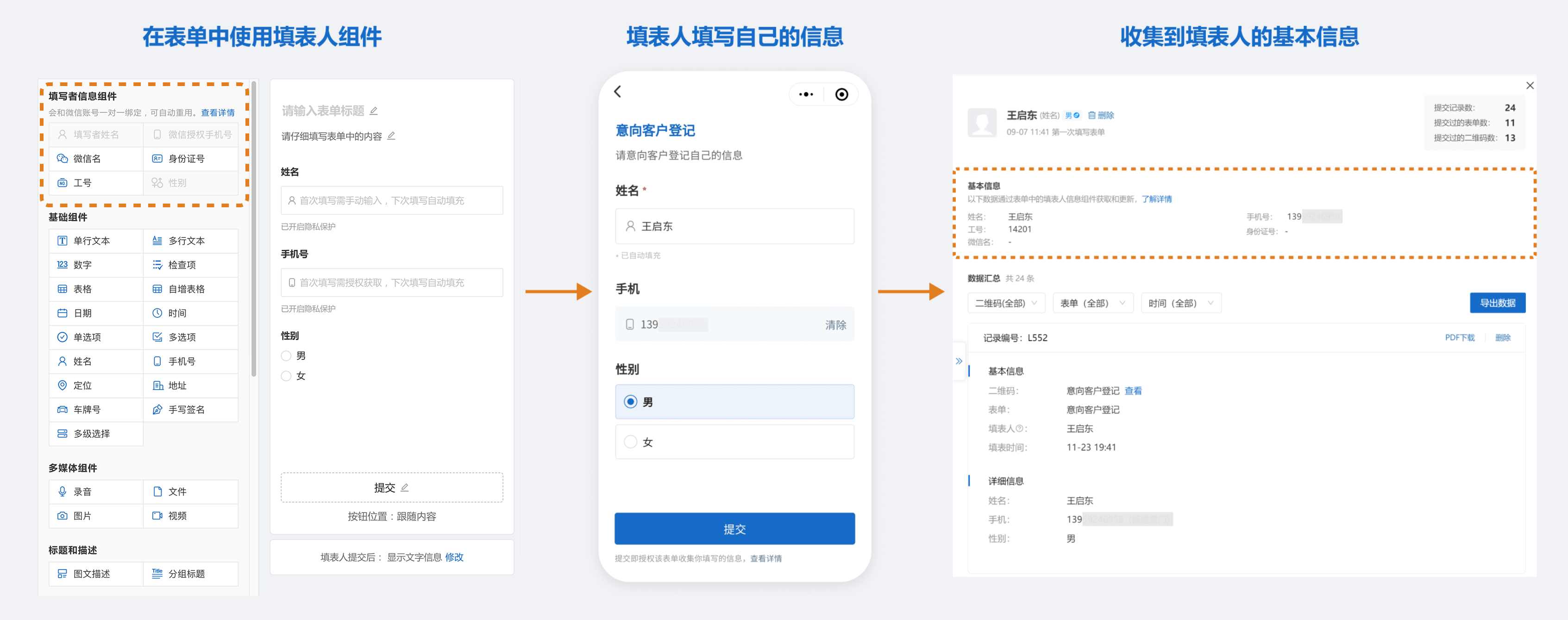 在表单中添加【填表人组件】,收集到填表人的对应信息,比如姓名、微信授权手机、性别等。填表人提交表单后,其各项基本信息就会自动显示到填表人列表中。