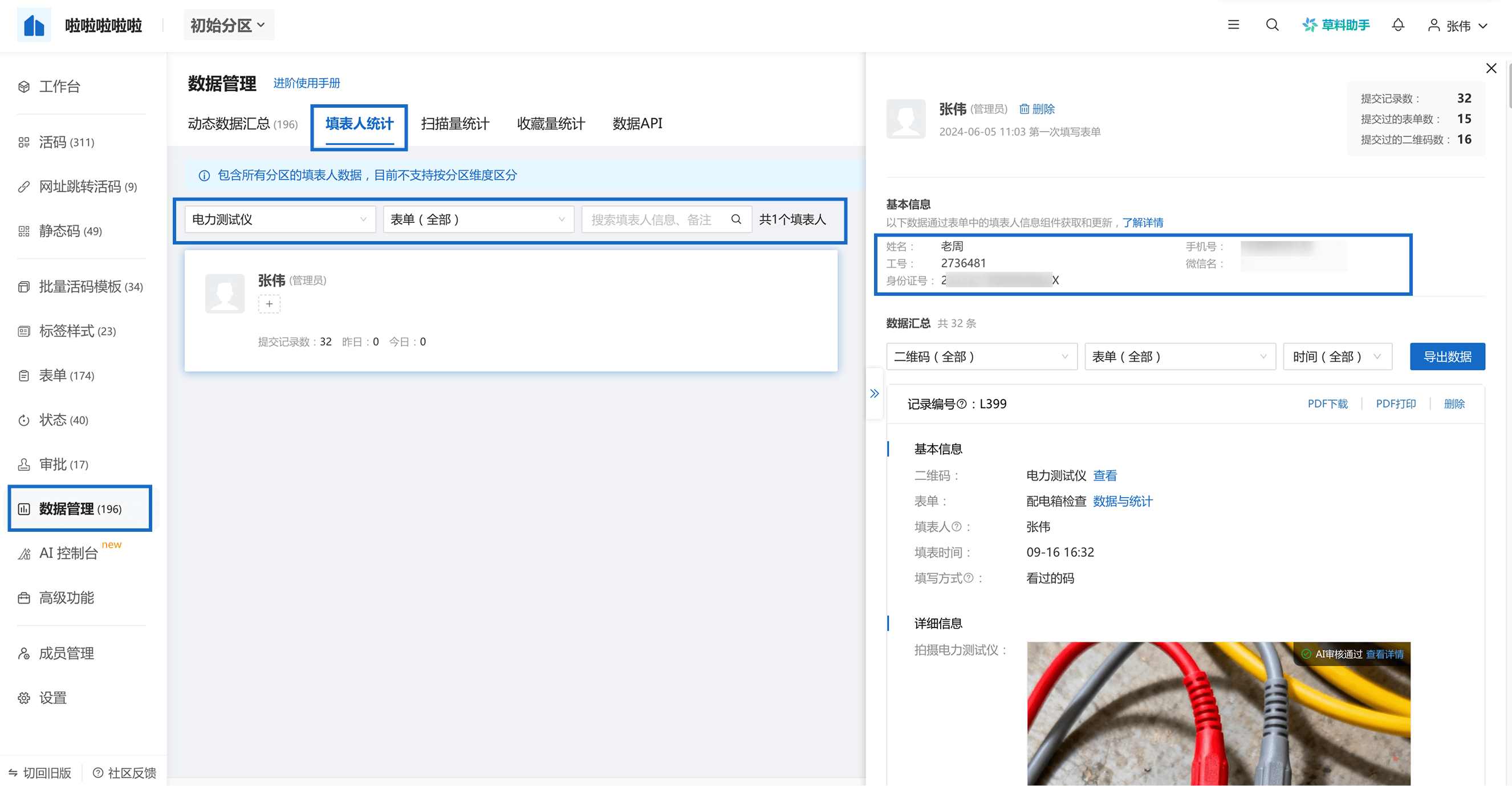 在后台,我们还可以了解填表人的信息。填表人是扫码填写了你的表单的人,包括你的员工、客户、学生、合作伙伴等等,在后台通过【数据管理-填表人统计】,即可查看他们的信息和提交的记录详情。
