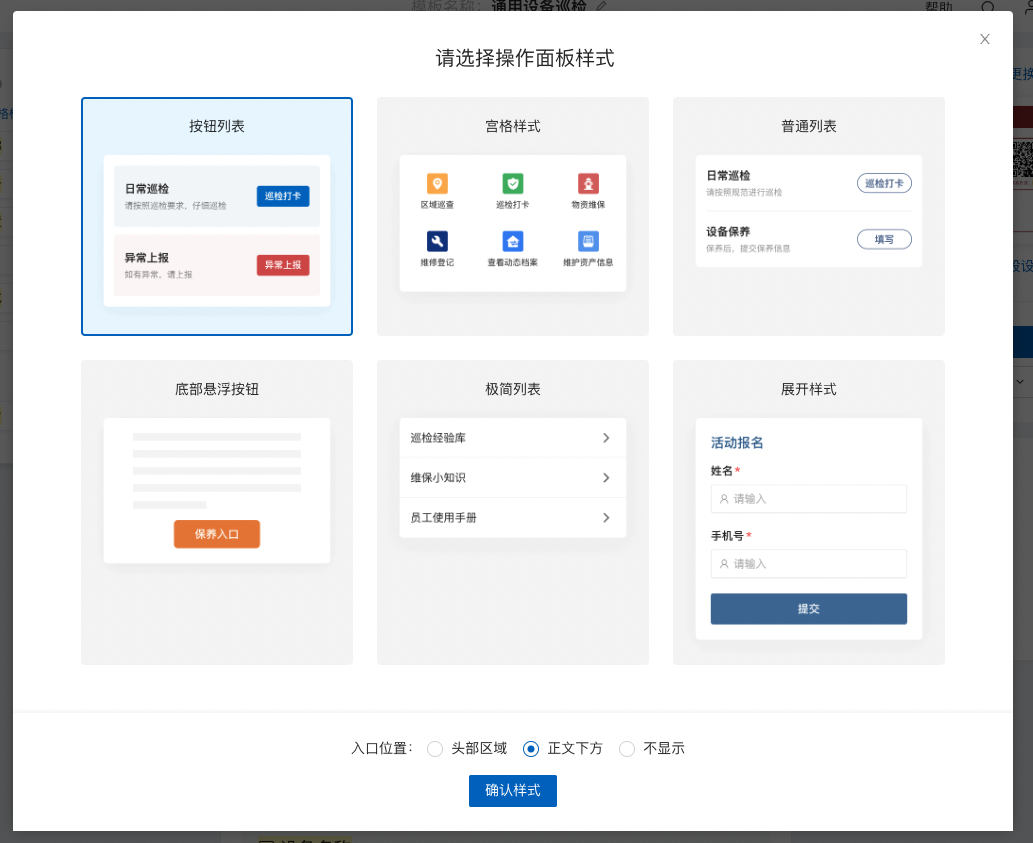 【方式A】添加表单到二维码后,表单就成为了该二维码中操作面板的一个操作项。通过对操作面板的展示样式和位置设置,可以实现表单的不同展现效果。