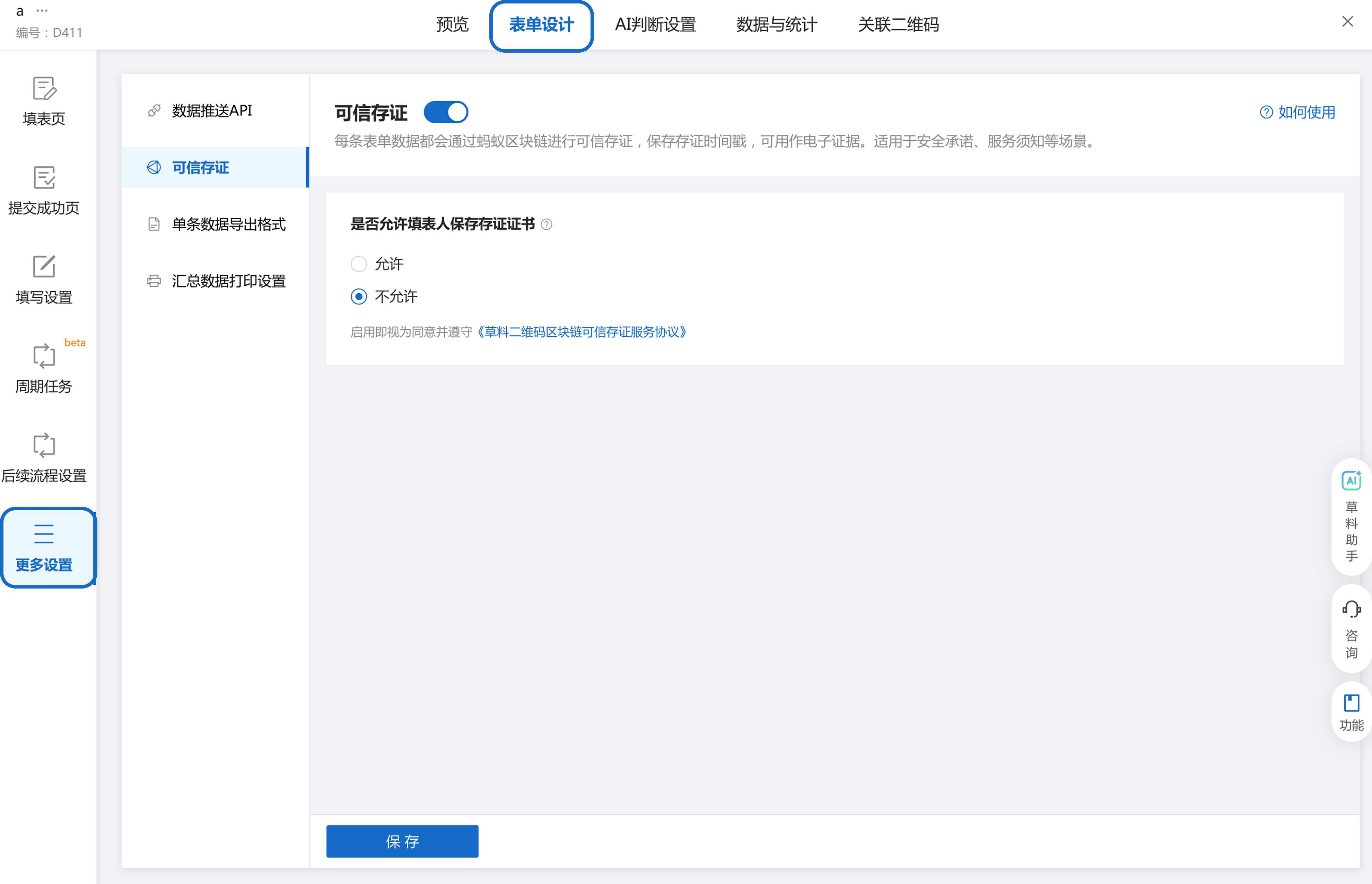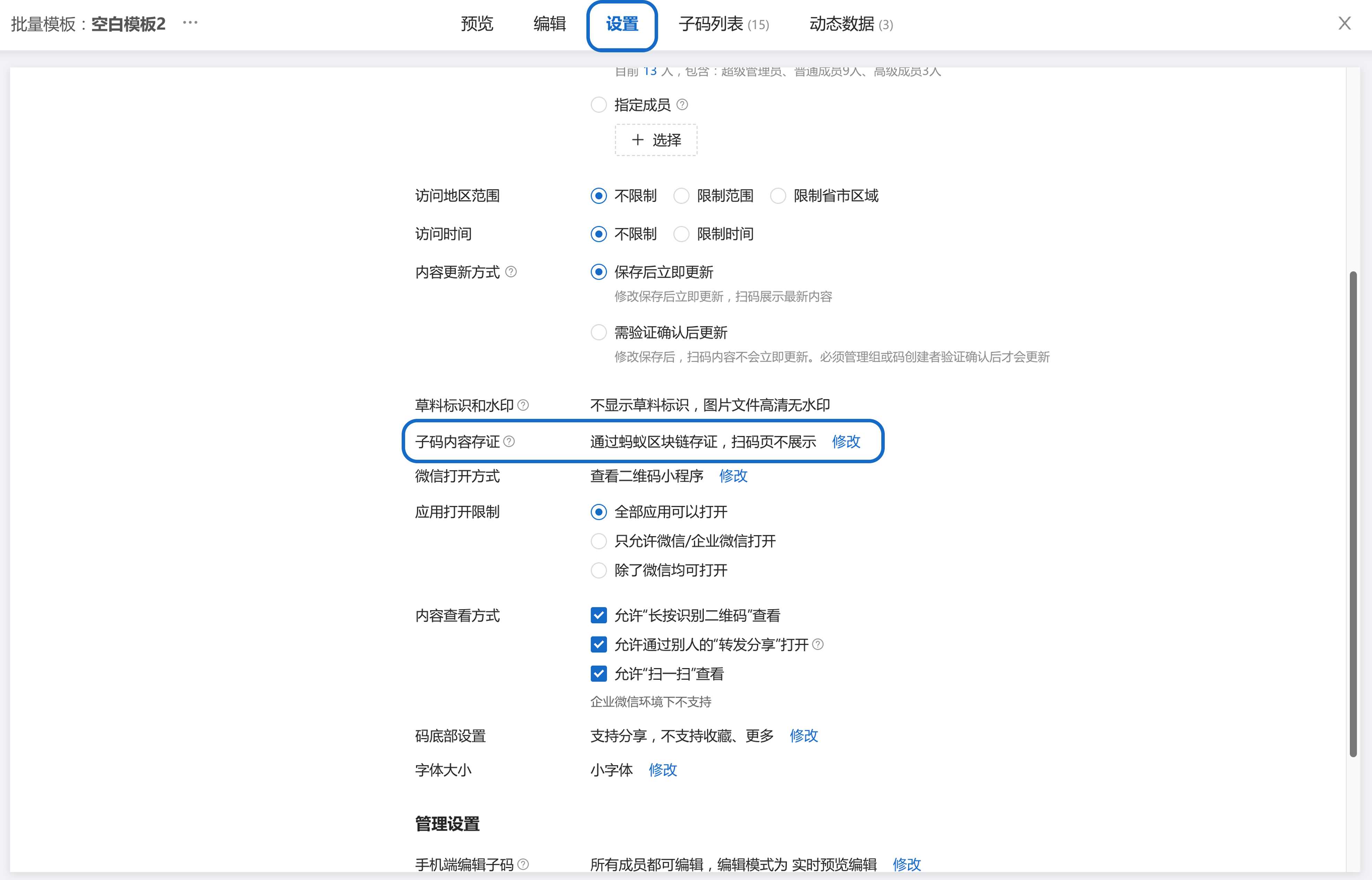 表单记录和批量模板子码内容的区块链存证已作为基础功能默认开启,无需手动配置。系统会在后台自动对数据进行上链存证。