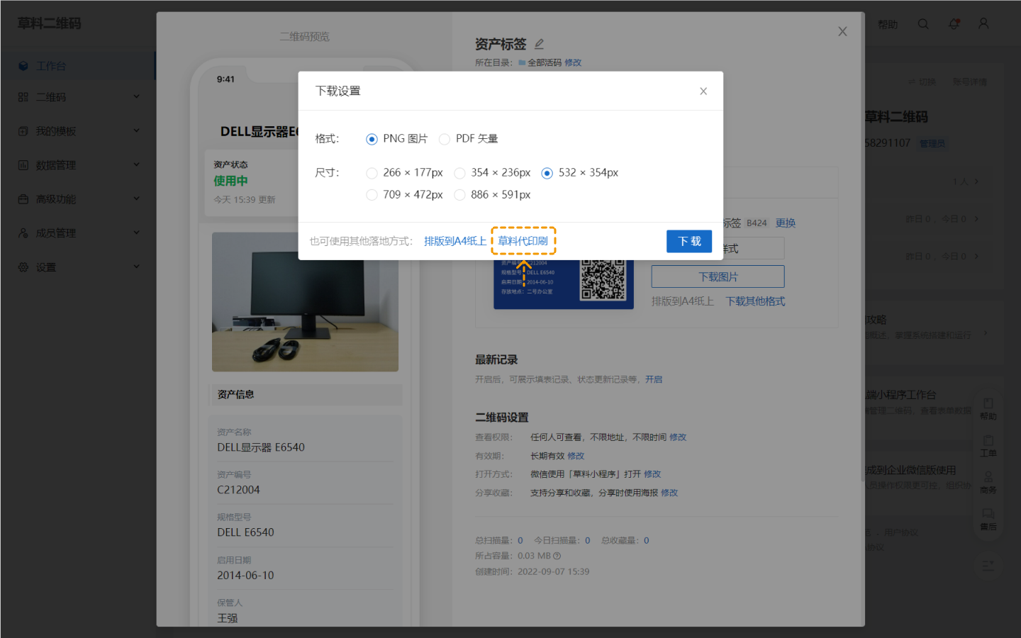 - 任意选择一个需要印刷的二维码,点击【草料代印刷】,选择对应尺寸材质,点击【确认去下单】 4. 在弹出的弹窗中,打开微信扫描二维码下单,数量填写标签总数,备注栏备注写明【邮件印刷+草料账户】,拍下付款即可。