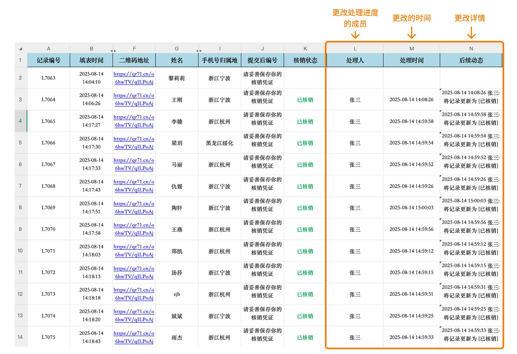 不过你可以与二维码凭证一起使用,在提交记录后生成二维码凭证,并使用连续扫码核销凭证的方式来达到处理进度的便捷修改。