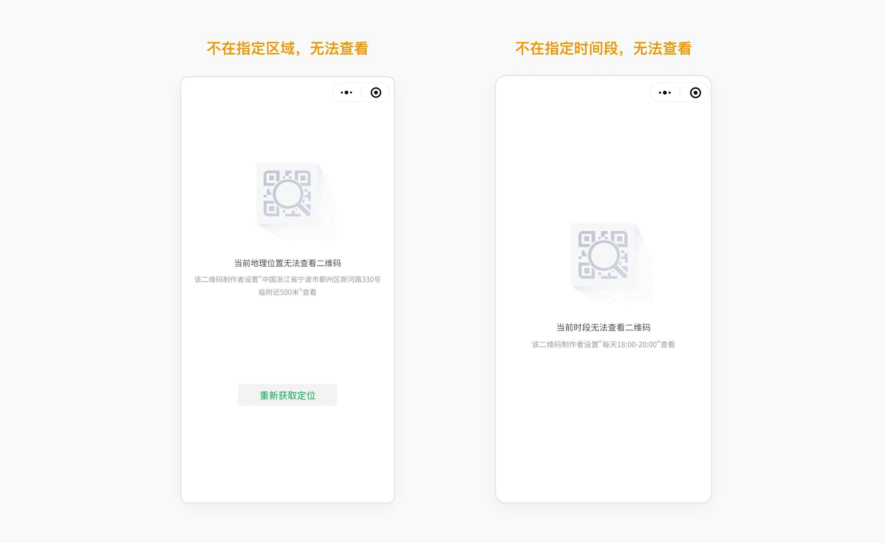 支持设置查看权限,限制可扫码查看人员,在指定区域范围内、指定时间,才可查看二维码内容。