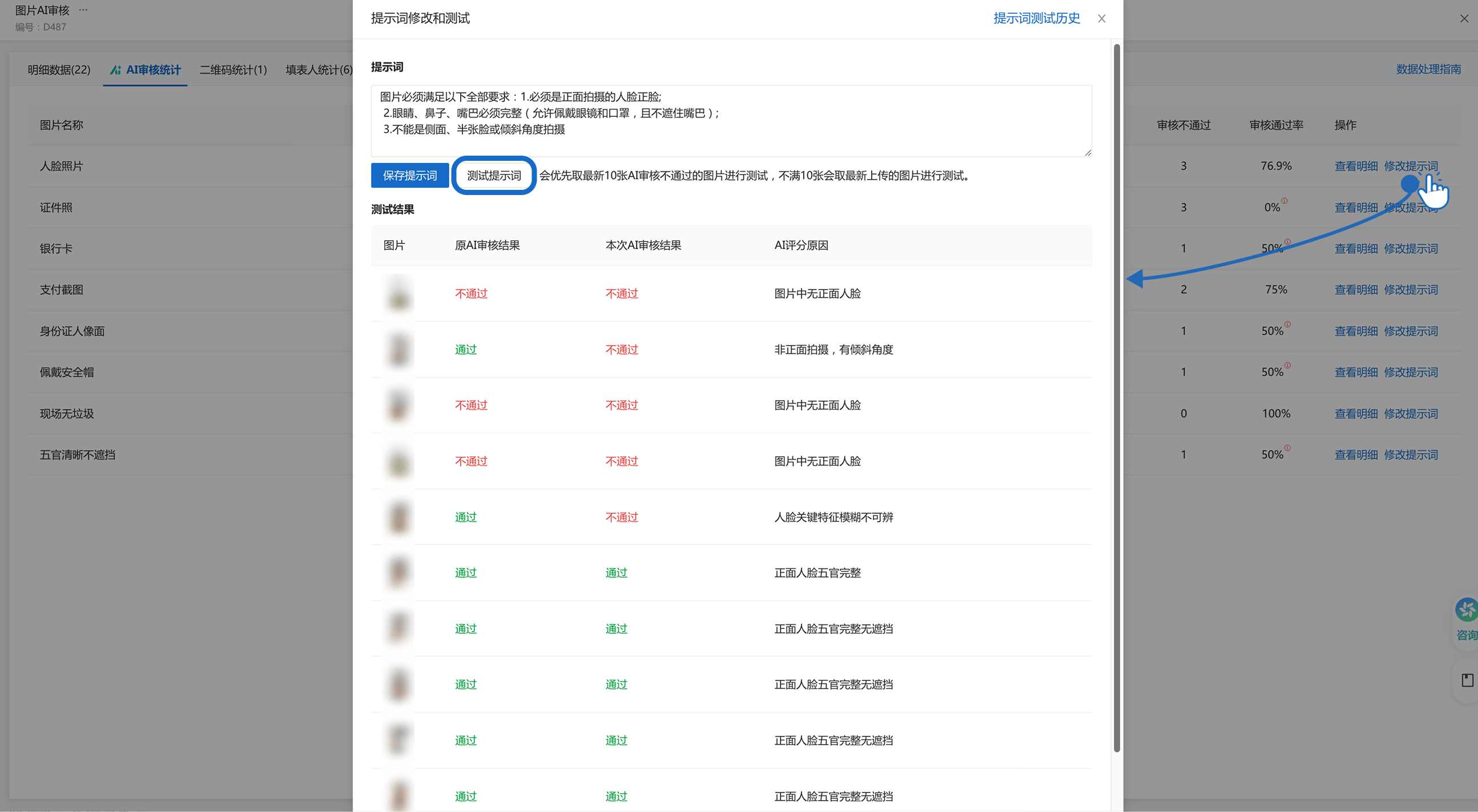 点击修改可选择预设的要求,也可以自定义输入审核提示词,请注意!提示词规范度决定ai审核的准确率!
