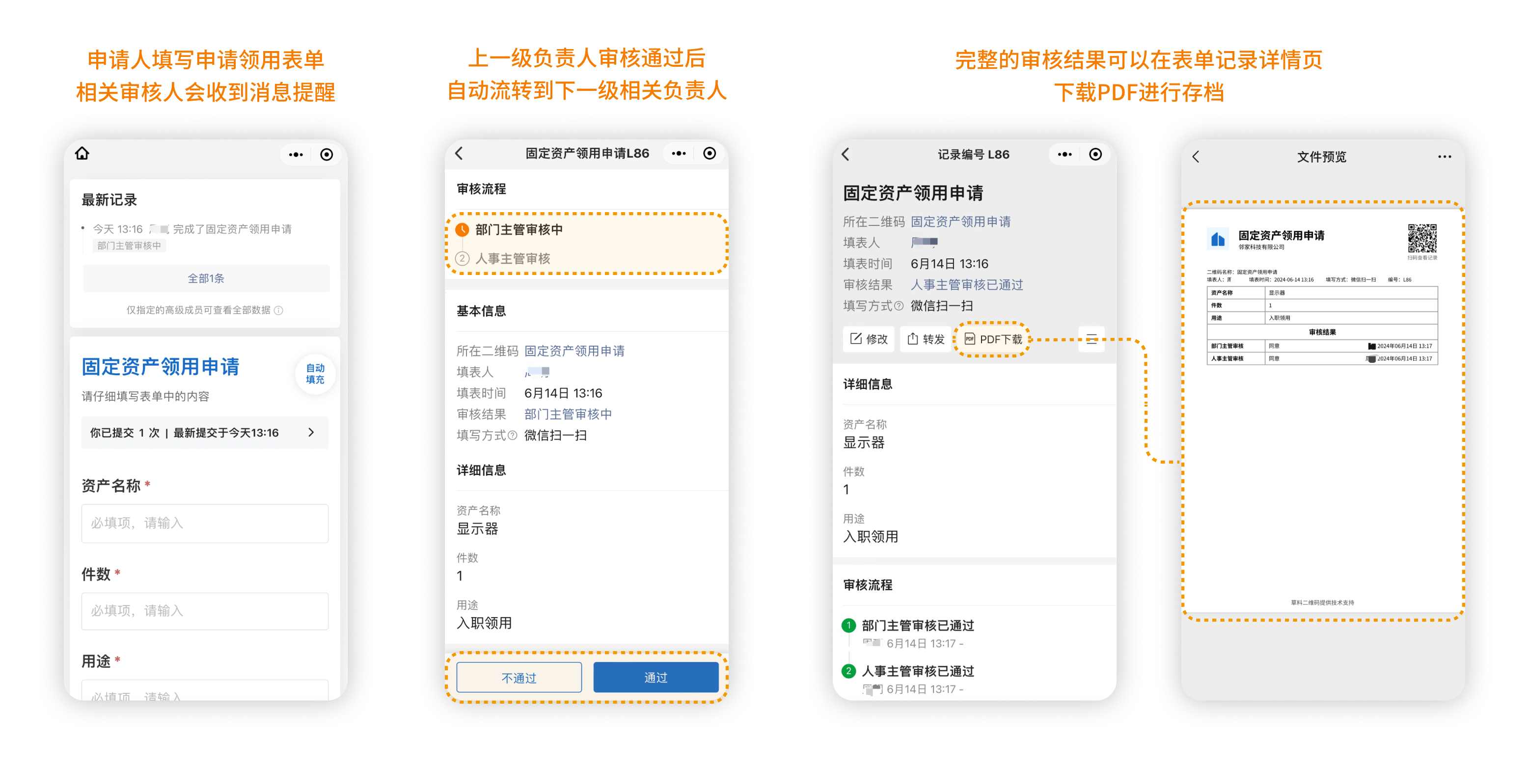 以资产领用表单为例,资产申请领用流程为: 个人申请--->部门主管审批--->人事主管审批--->个人前往仓库领用.