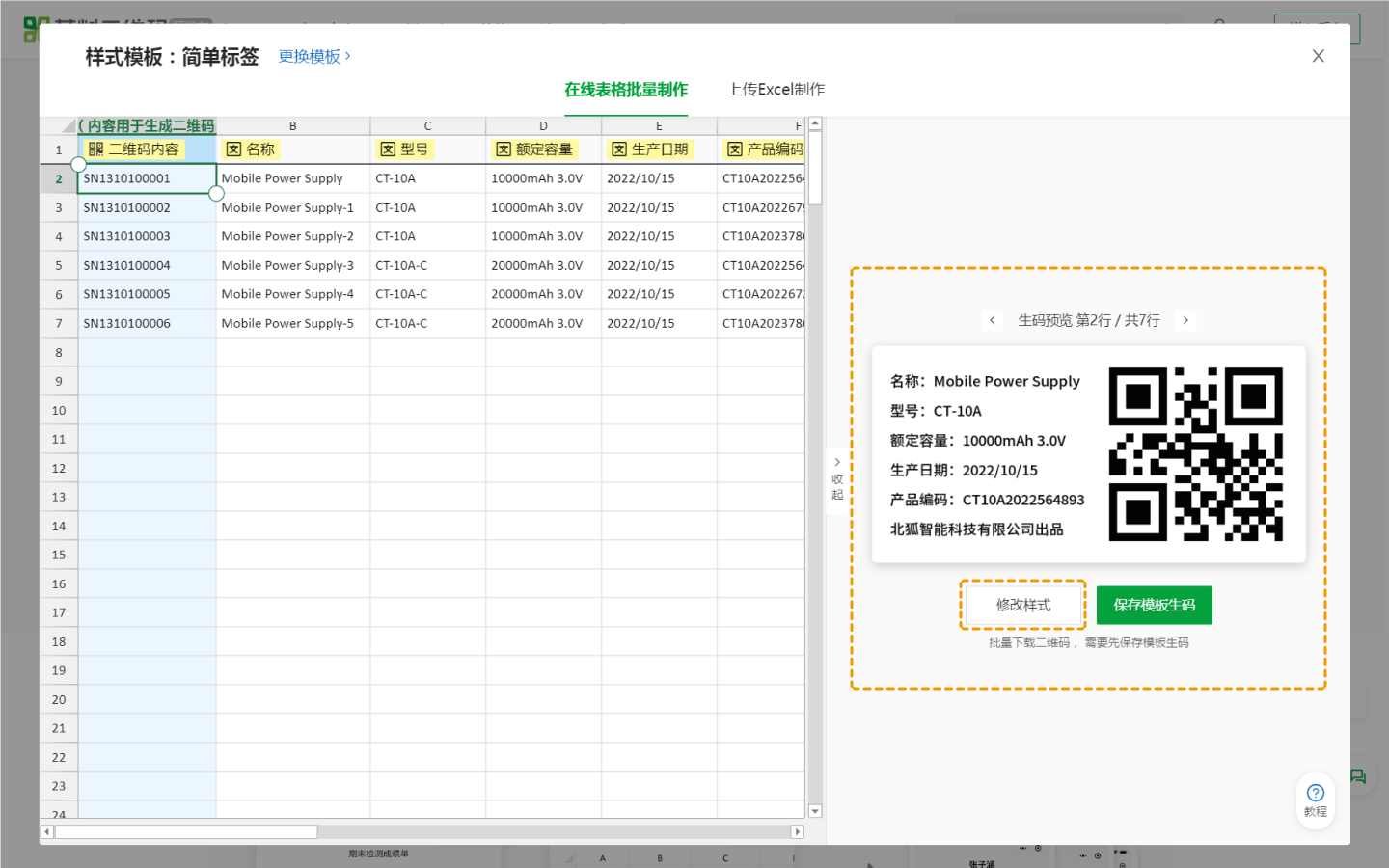 在右侧标签预览区域可以修改标签样式以及标签上显示的内容(字段内容),制作更符合企业形象的二维码标签。点击【修改样式】进入样式编辑器 查看教程