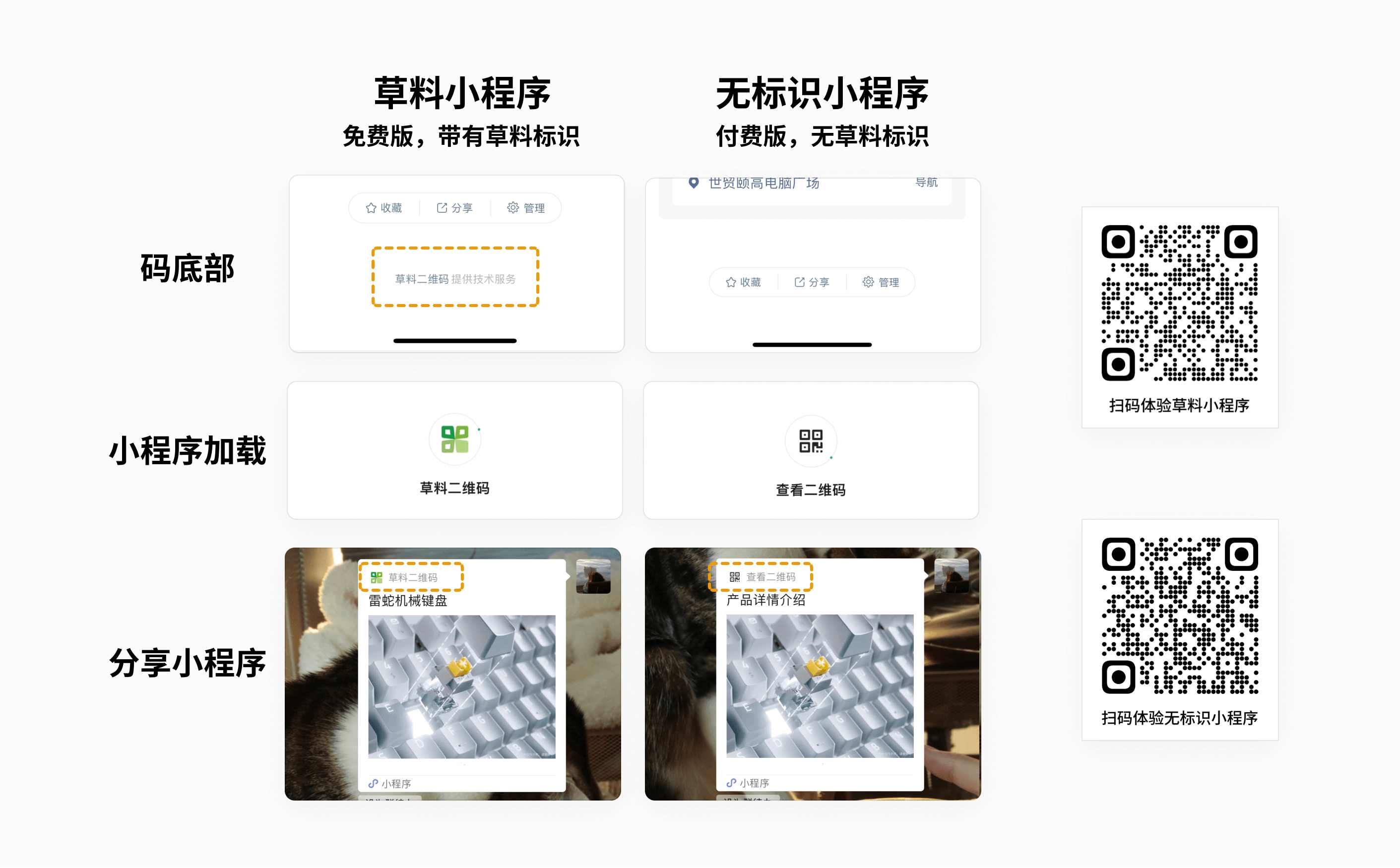 - 草料小程序、无标识小程序:免费版使用草料小程序打开。付费版可使用无标识小程序,去除草料标识。
