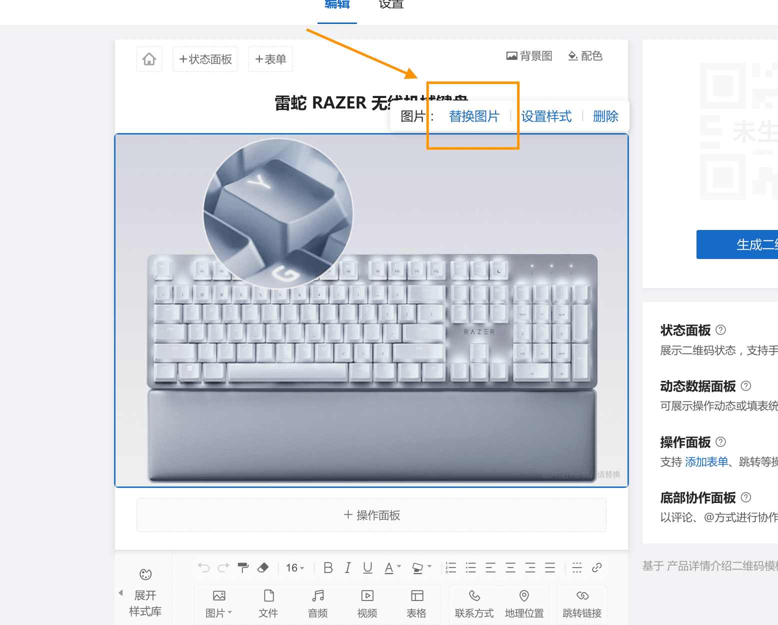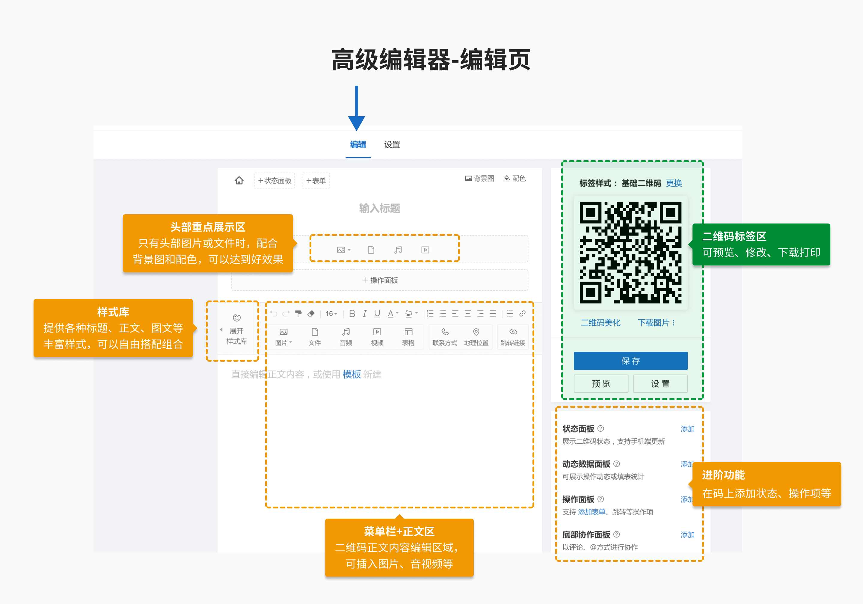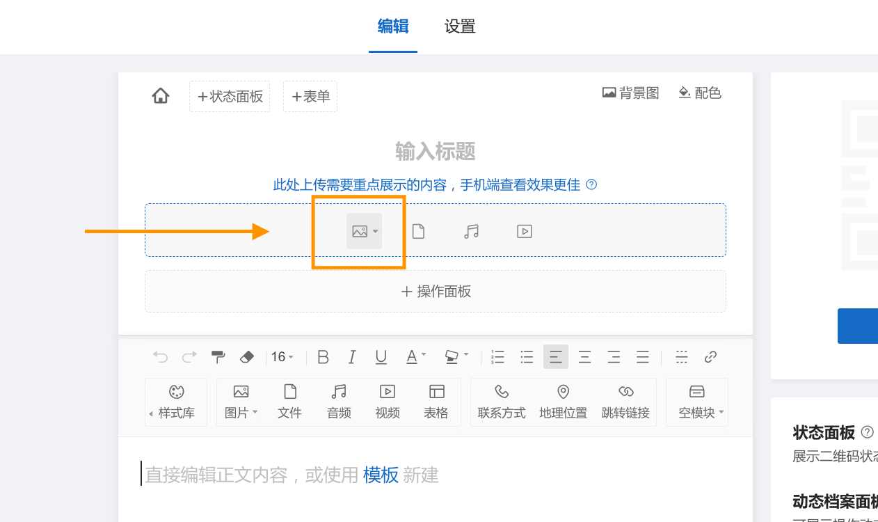 - 编辑内容:指的是如何把图片、文件、音视频等素材添加到二维码中,扫码后可查看