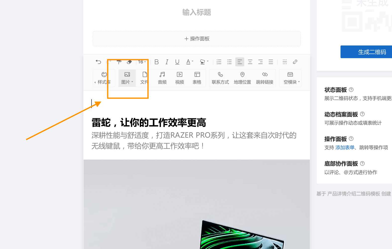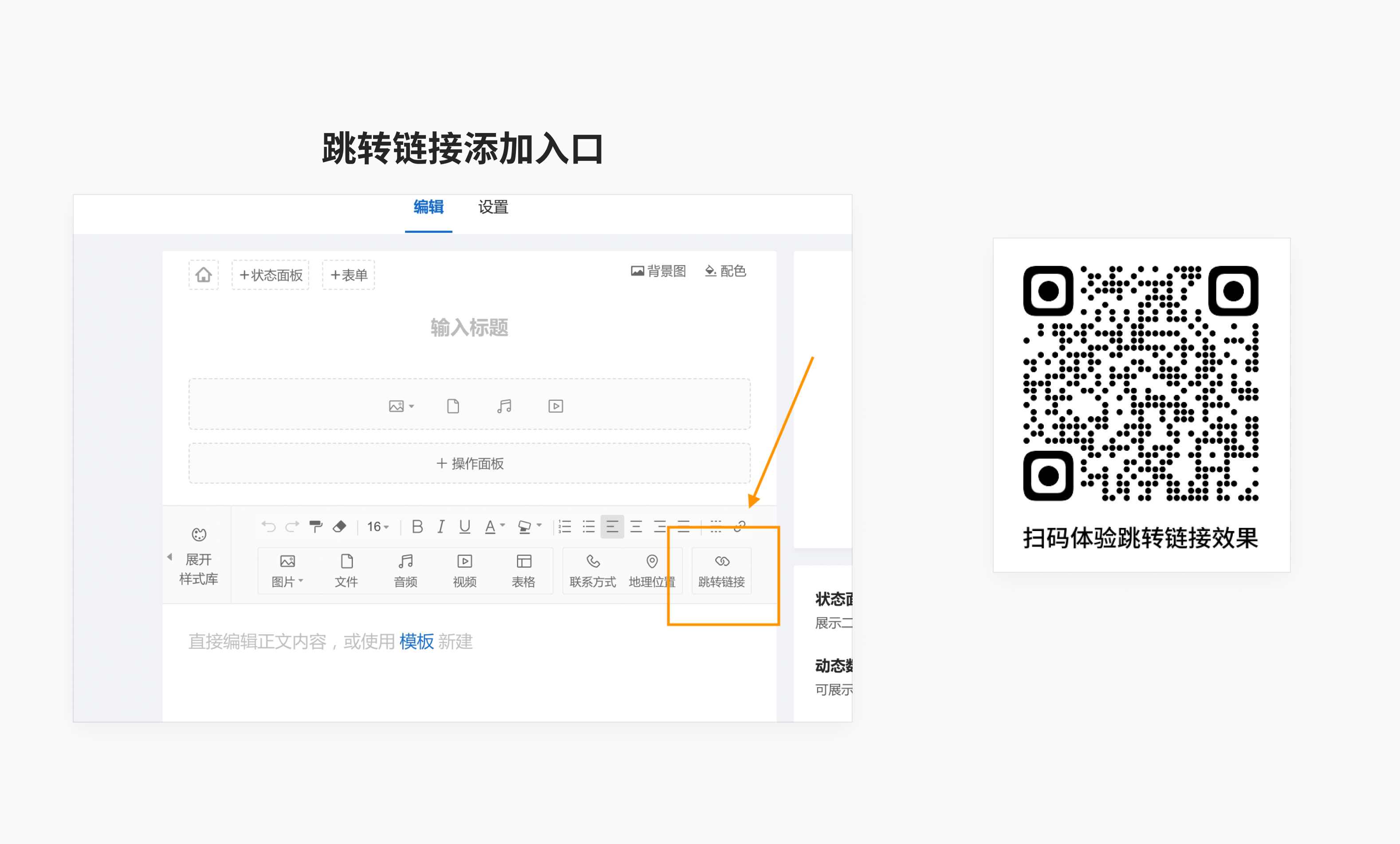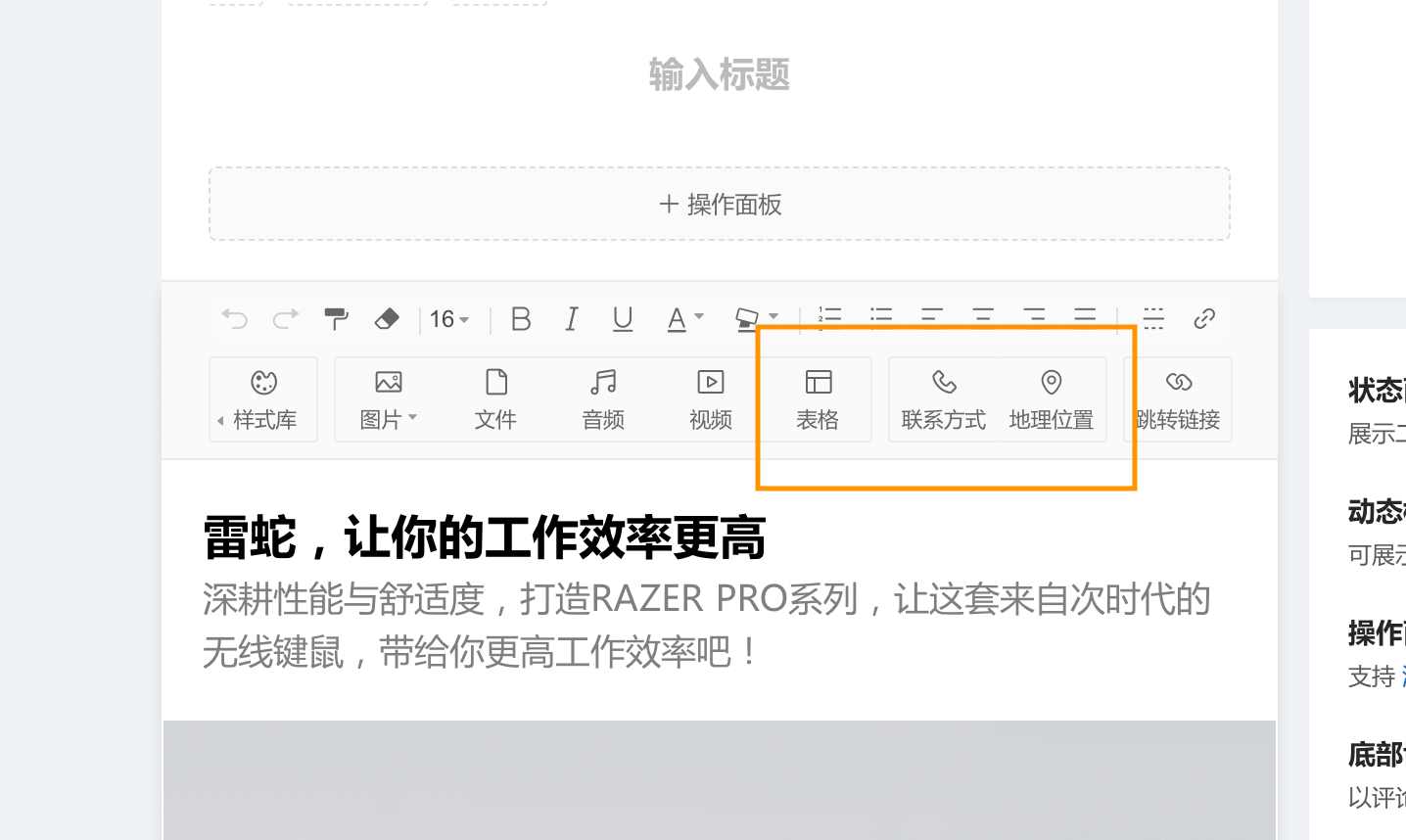 - 菜单栏:在正文中插入图片、文件、音视频、跳转链接等。