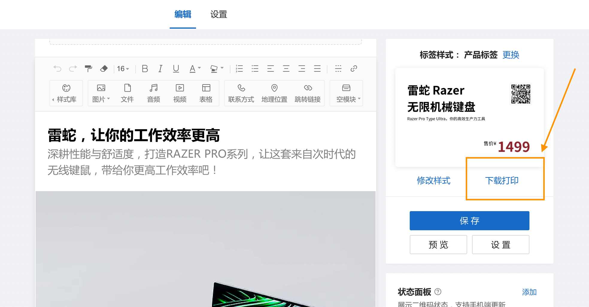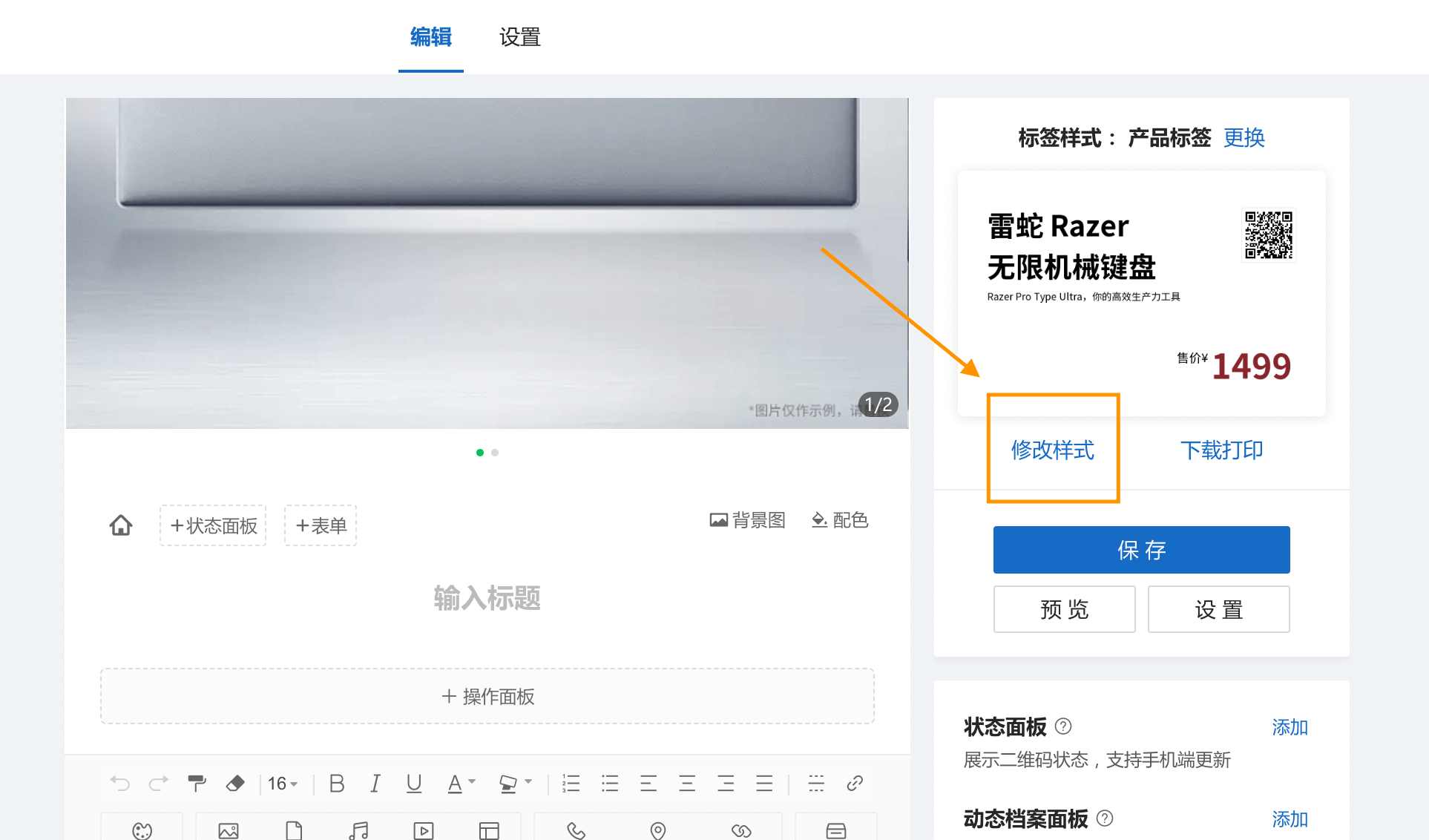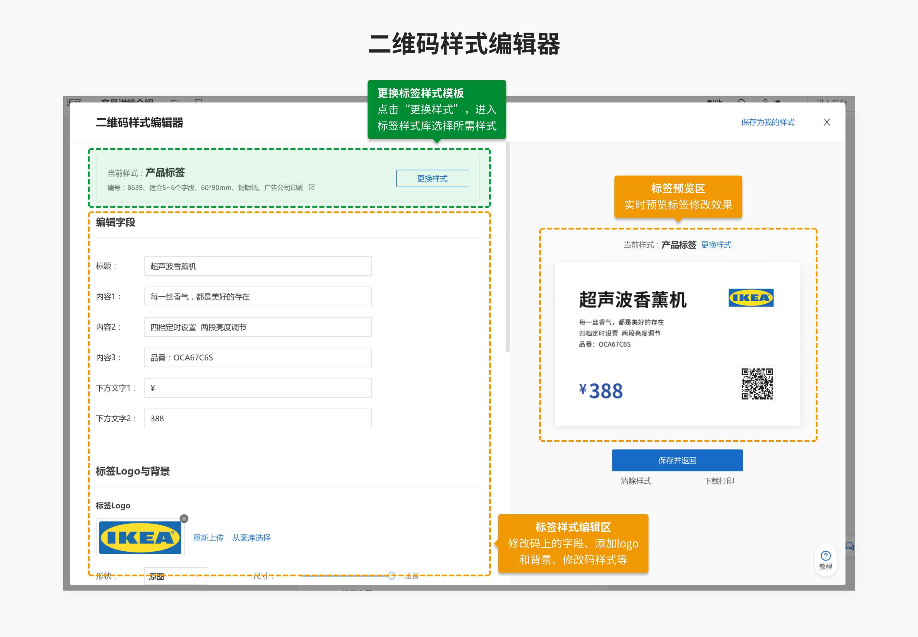 在二维码样式编辑器内,你可以更换标签样式模板、修改标签字段内容、修改logo和背景等。