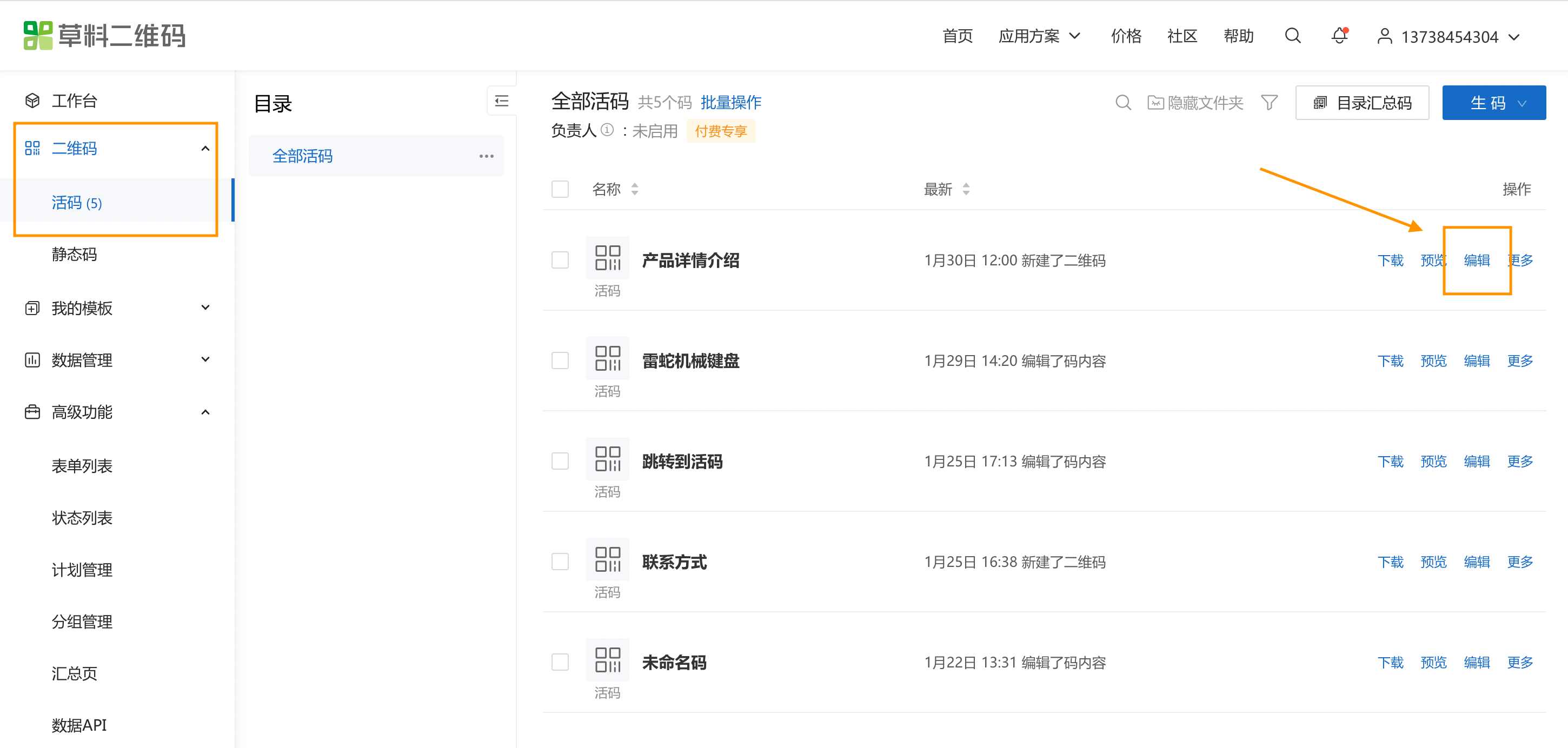 进入后台,在二维码-活码中,找到需要修改的码,点击右侧的“编辑”,进入二维码编辑器,即可修改二维码内容。