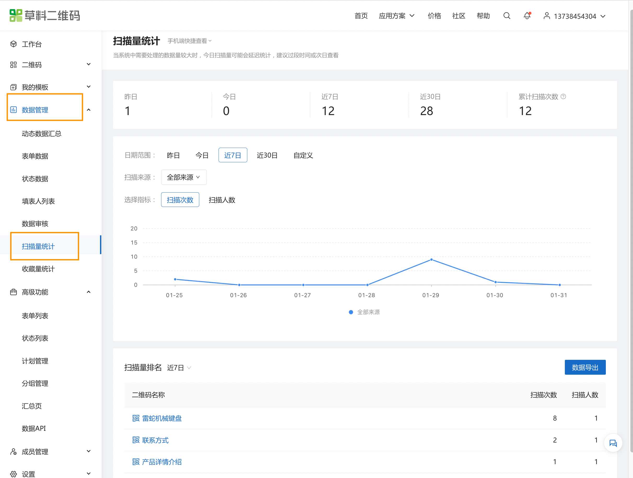 数据统计-扫描量统计中,可以查看不同二维码、不同时间范围、不同扫码来源查看扫描人数、次数。