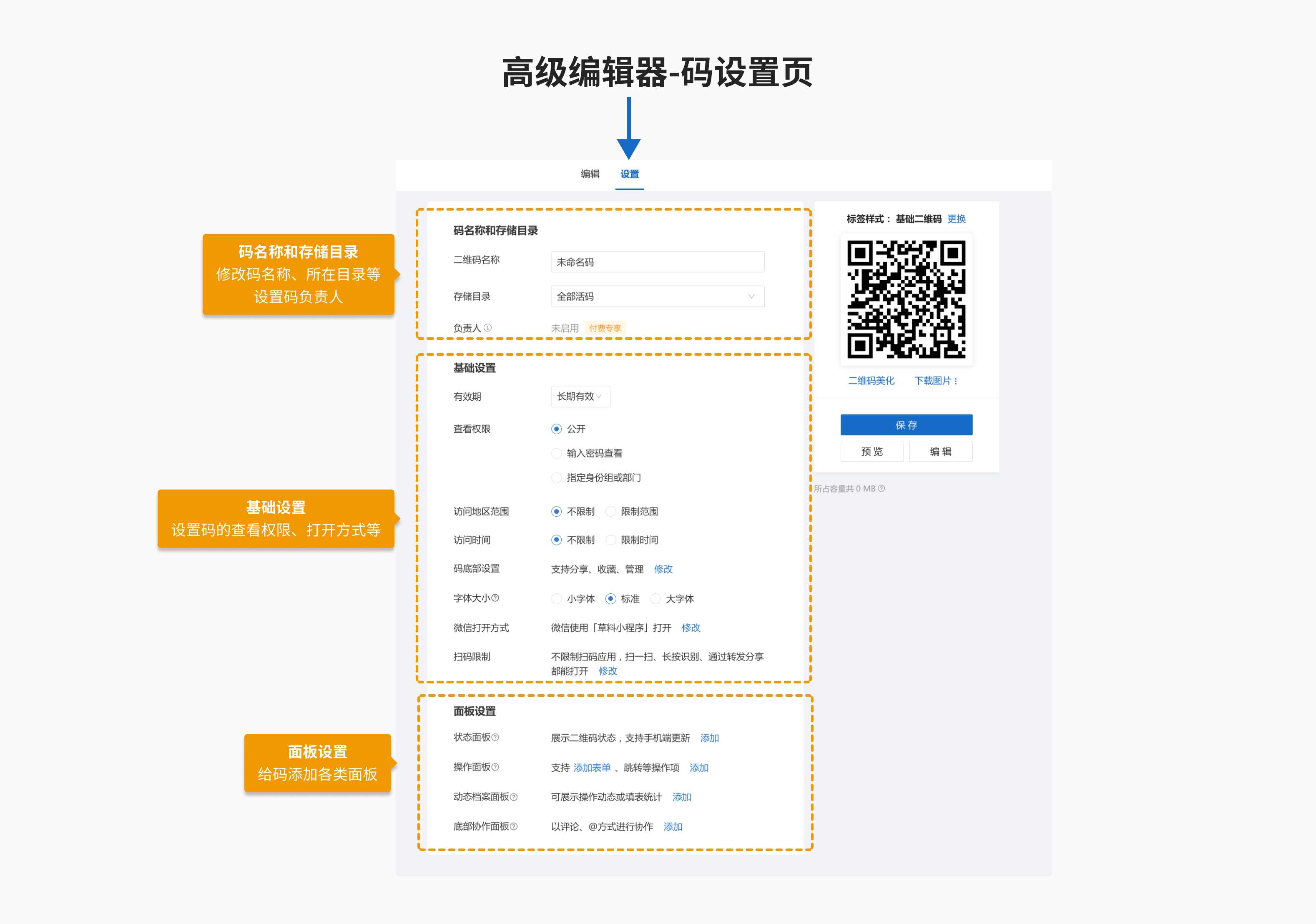 - 二维码设置:有效期、查看权限、打开方式等除内容以外的设置项