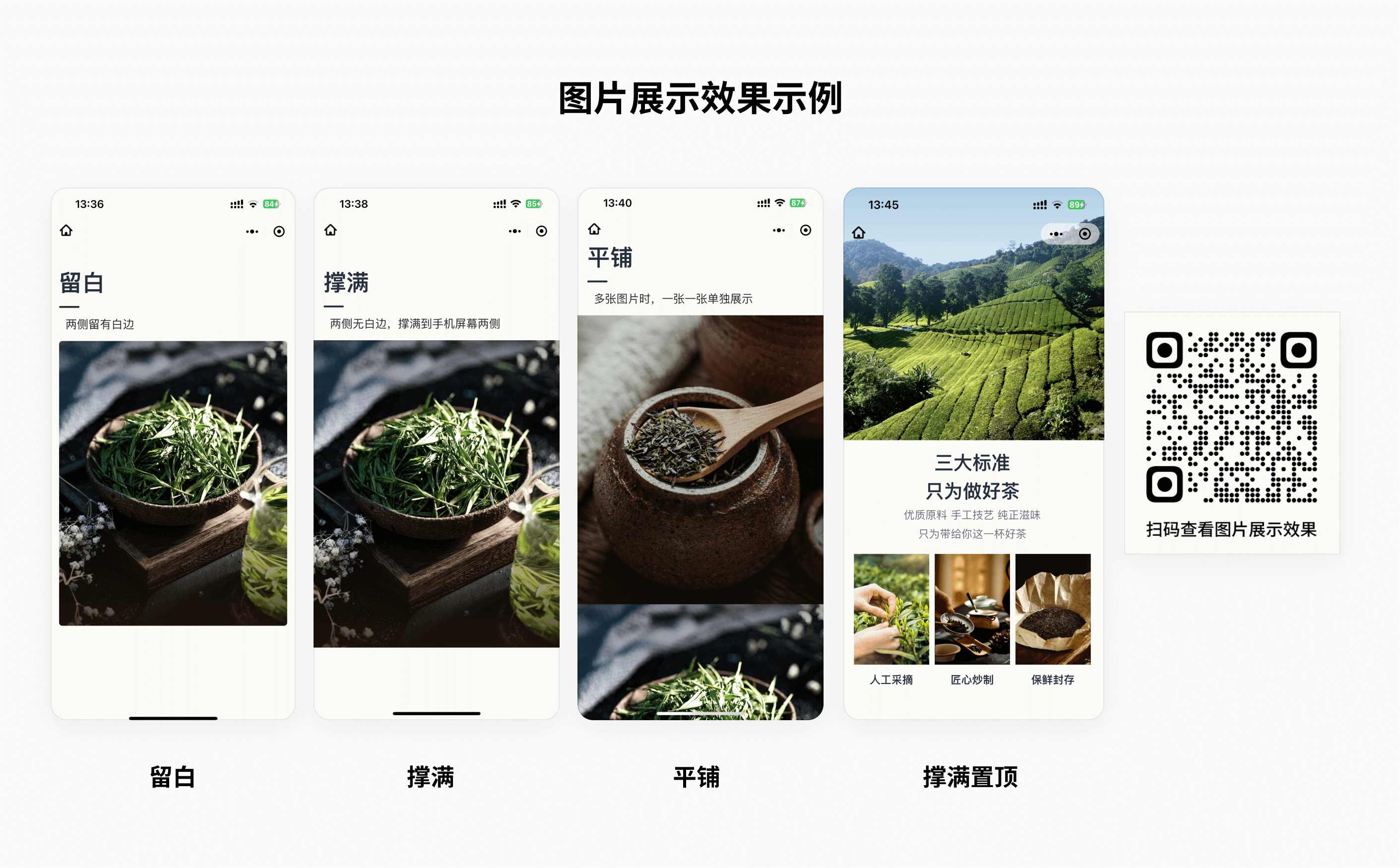 类似淘宝的产品主图,可设置轮播、平铺、留白、置顶等各种展示效果,结合配色设置,整体效果更佳。