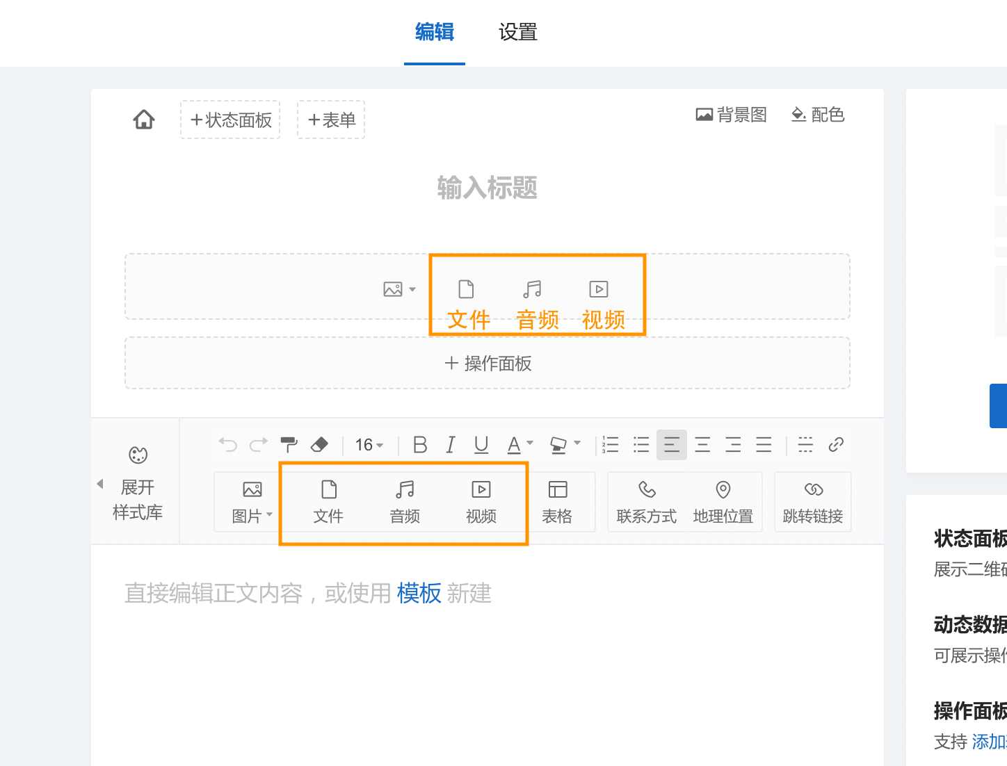 可以在头部和正文区域这两个区域添加文件、音视频。