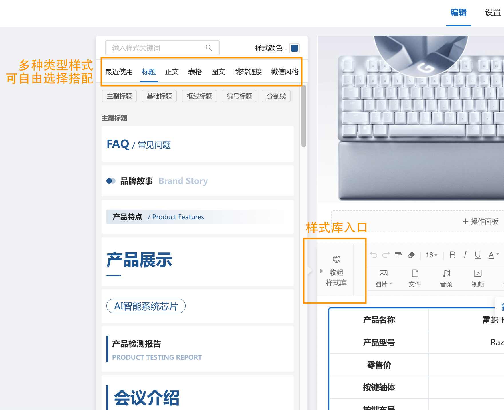 - 样式库:在正文中插入多种样式的标题、图文等,可自由搭配组合。