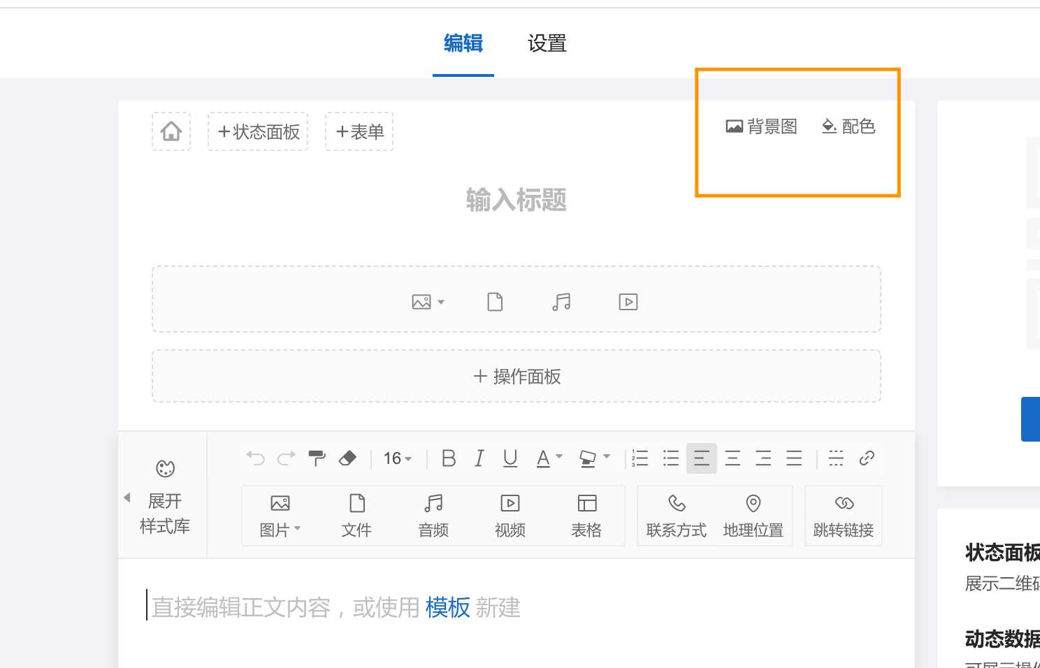 - 进阶功能区:添加状态面板、动态数据面板、操作面板、底部协作面板