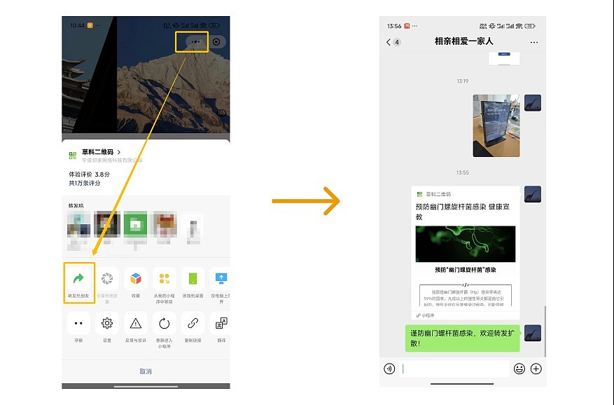 2.如果是发送到微信,可以扫码打开做好的二维码,点击右上角的「···」,选择转发给患者、家属个人或微信群。