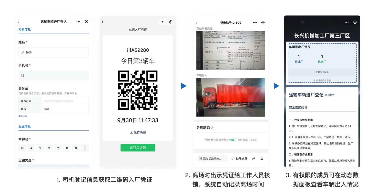 安保人员:使用手机或扫码设备扫描凭证,完成核销,系统自动记录出厂时间